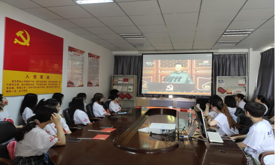 学生党员怀着喜悦和激动的心情,在学院党建活动室集体观看庆祝中国共产党成立100周年大会。观看过程中,同学们倍受鼓舞,习近平总书记重要讲话结束,党员们集体唱响《歌唱祖国》,用嘹亮的歌声向党宣誓:请党放心,强国有我!