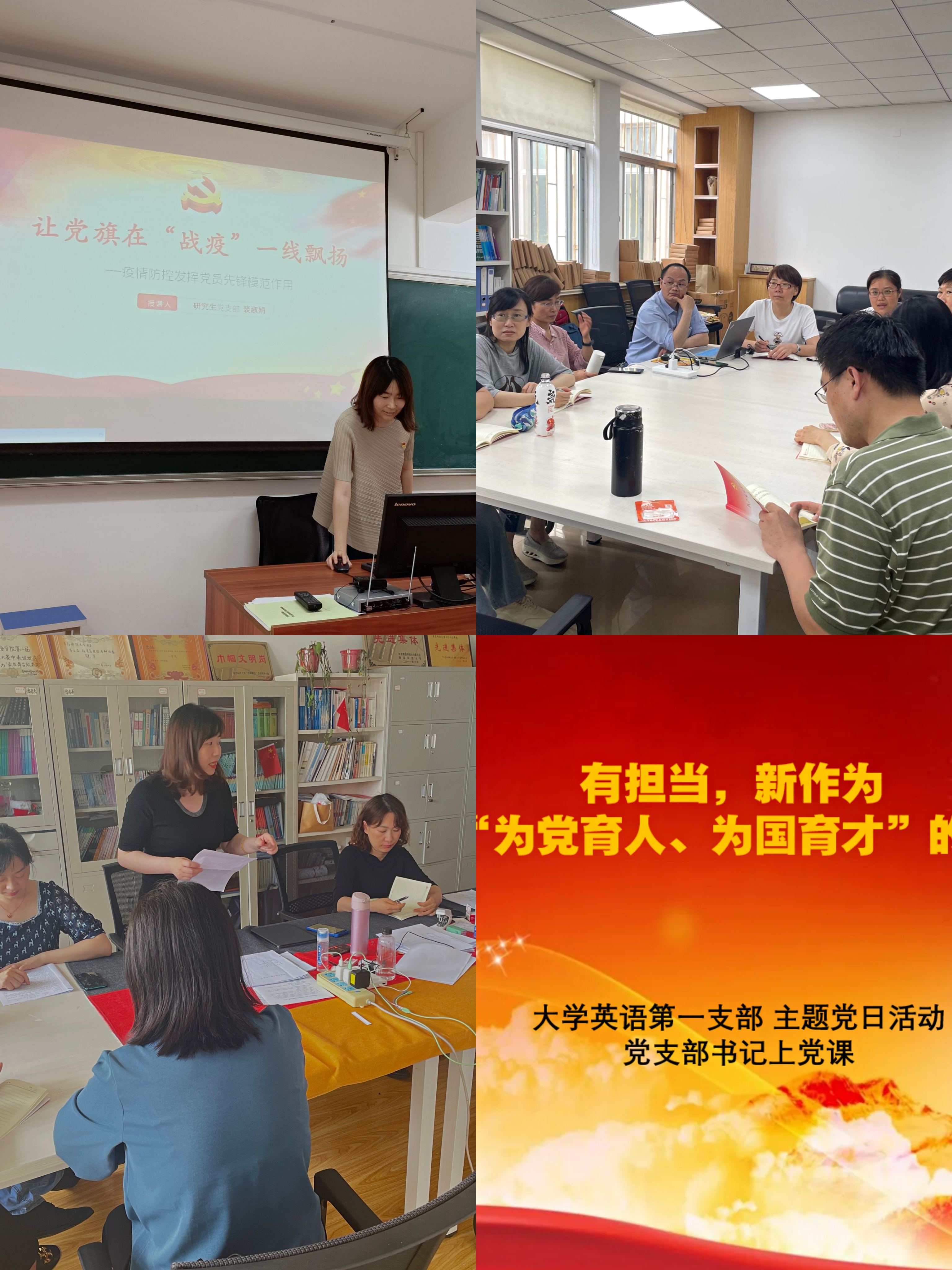 各党支部书记也通过多种形式,开展了《立德树人铸师魂不忘初心正师风》、《有担当,新作为:做好“为党育人、为国育才”的领路人》、《中华人民共和国元帅—聂荣臻》、《让党旗在“战疫”一线飘扬--疫情防控发挥党员先锋模范作用》等党课活动。