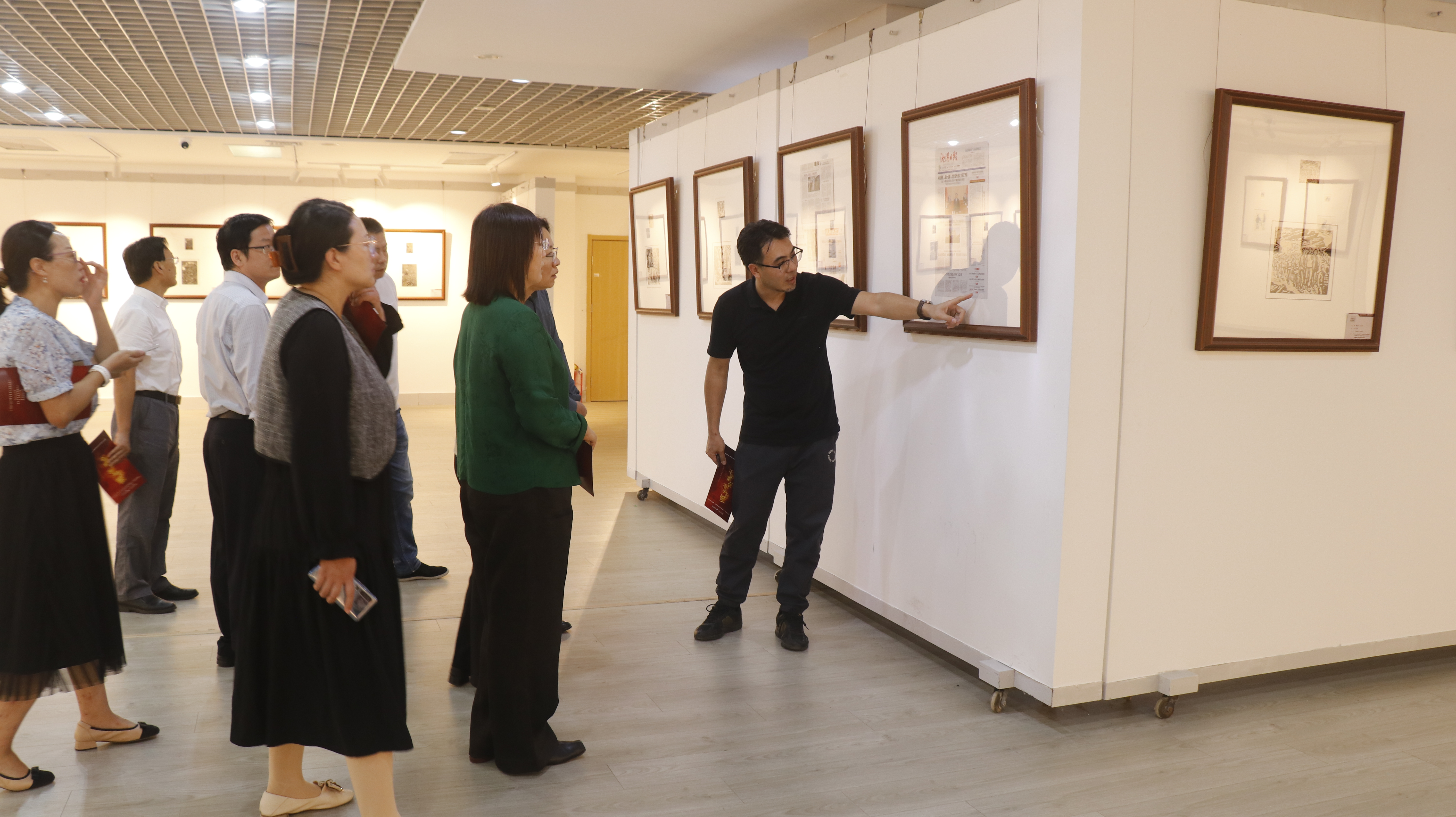 在集中的理论学习之后集体到艺术学院一楼美术馆,参观“画笔为枪 民族救亡”弘扬抗战精神主题连环画展。在艺术学院禹青教授的专业讲解下,大家观看展览,镌刻浓厚的历史记忆,厚植爱国奋进的情怀,更好地铭记历史、坚定信念;进一步强化了国防观念和忧患意识,凝聚关心国防、热爱国防、建设国防、保卫国防的思想共识。