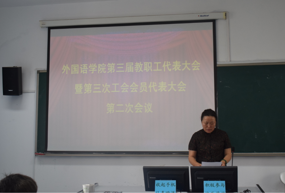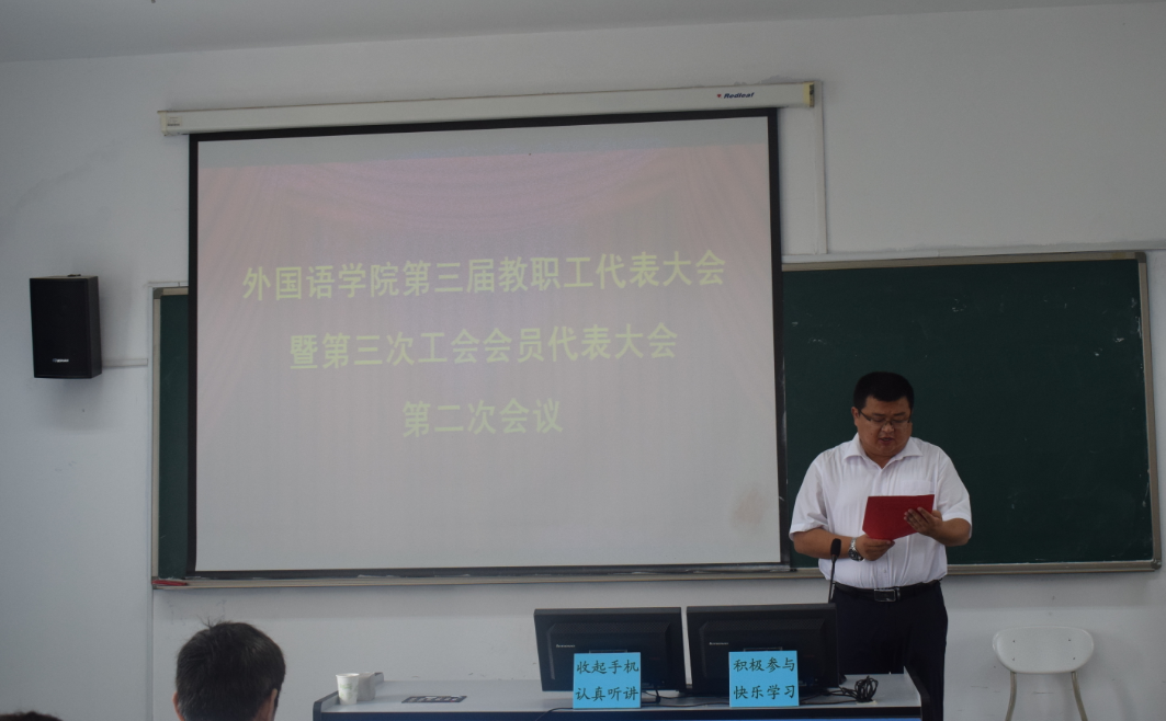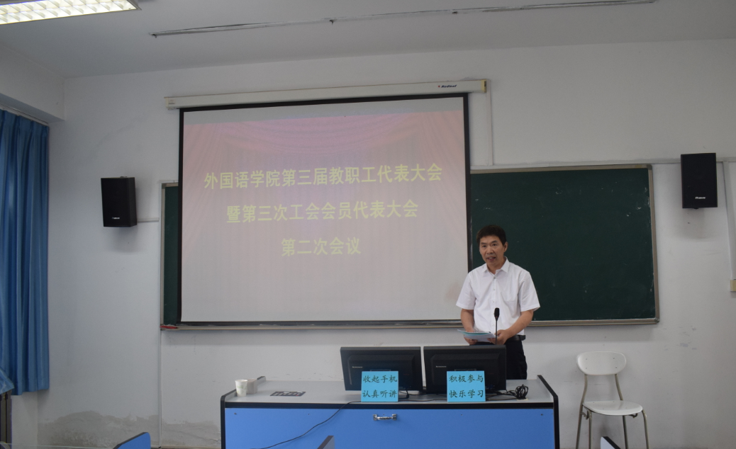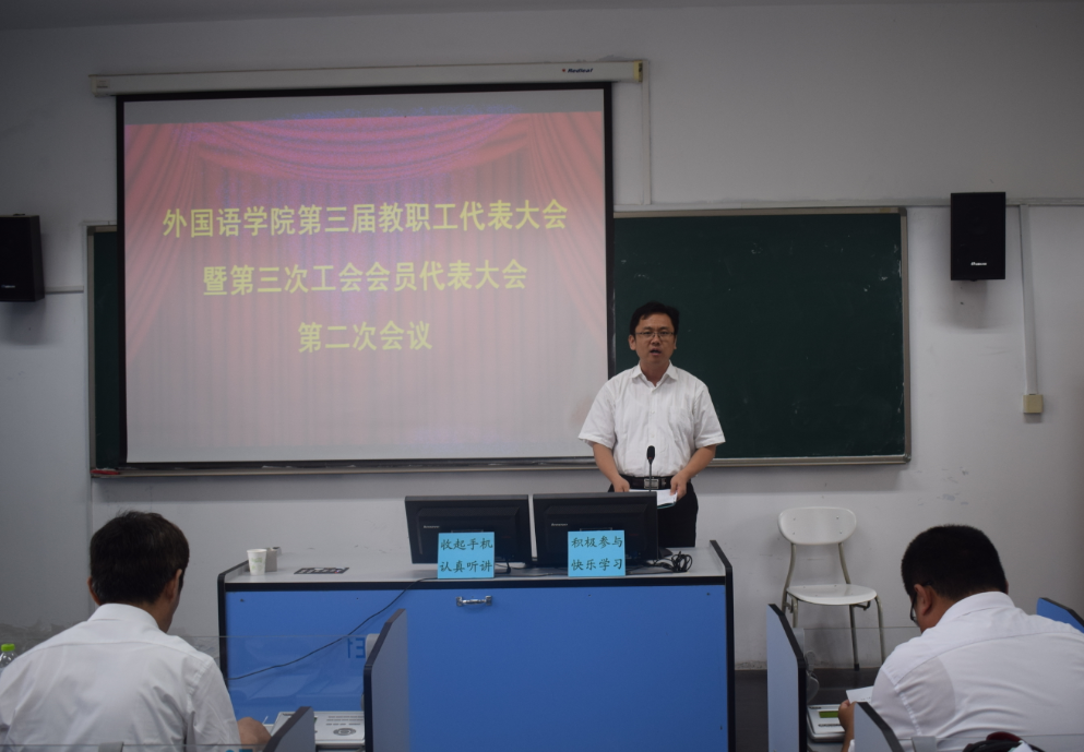 2019年7月17日,2026世界杯官网第三届教职工代表大会暨第三次工会会员代表大会第二次会议在418语音室召开,应到代表60人,实到52人。会议由党总支副书记兼副院长宋飞主持。