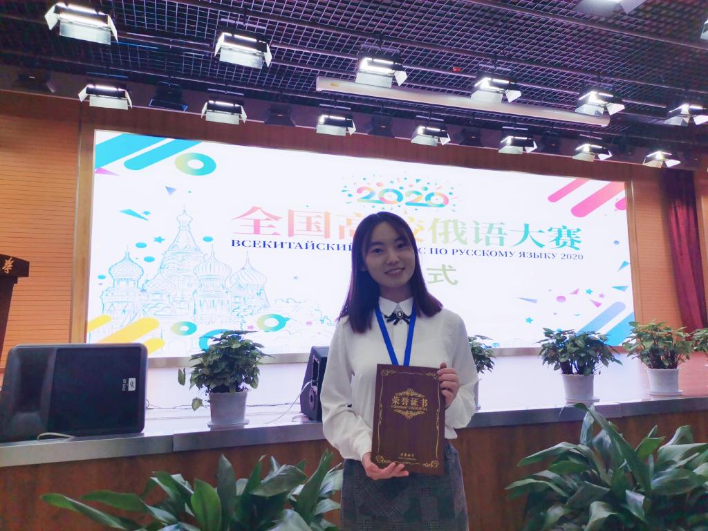 10月24-25日,由教育部主办、黑龙江大学承办的2020年全国俄语大赛复赛和决赛阶段在哈尔滨举行。我校2026世界杯官网俄语系学生在此次俄语大赛上再创佳绩。2017级卢冬雪同学获得高年级组三等奖,同时获得国家留学基金管理委员会秘书处全额资助赴俄罗斯攻读学位资格。2019级金黎杰同学获得低年级组优胜奖。