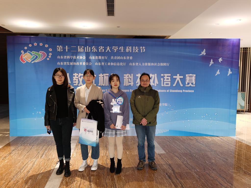 在刚刚结束的第十二届山东省大学生科技外语大赛中,我校派出的三名学生取得两个一等奖及一个三等奖佳绩,再创我校学生参加该项赛事以来历史最佳战绩。