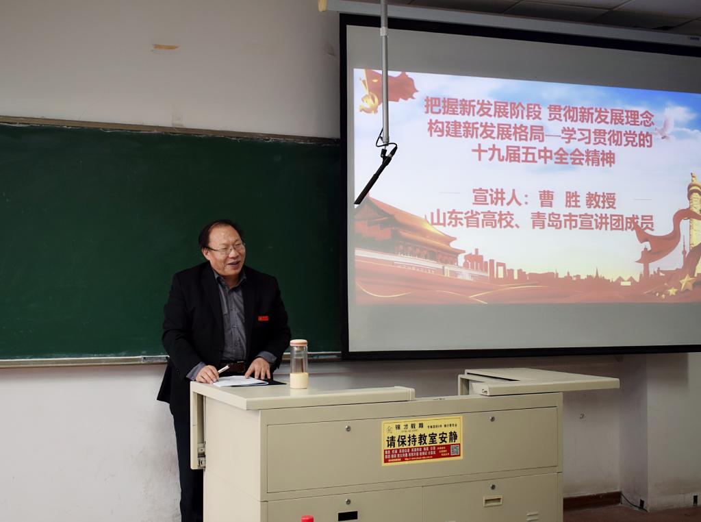 马克思主义学院院长曹胜教授为全体青马班学员作了题为《把握新发展阶段 贯彻新发展理念 构建新发展格局——学习贯彻党的十九届五中全会精神》的讲座。曹胜院长用通俗易懂的话语,提纲挈领,深入浅出,从十九届五中全会的主要概况、“十三五”经济社会发展成就回顾、五中全会如何书写大变局下的“中国故事”这三个方面为全体青年马班学员全方位解读党的十九届五中全会精神,并号召更多青年马克思主义者站稳立场、坚定信念、锻炼能力、敢于担当,争做新时代民族复兴大任的追梦者和圆梦人。