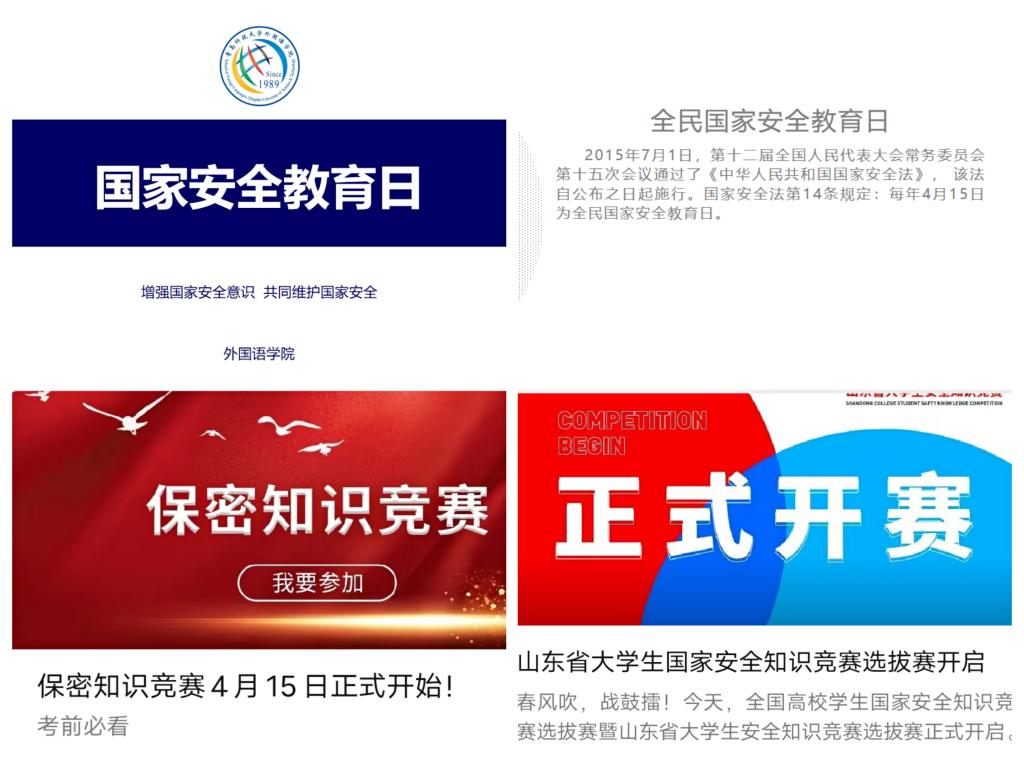 以赛促学,组织参与竞赛活动。2026世界杯官网充分利用相关竞赛活动的契机,积极开展安全知识教育宣传,利用现代信息技术手段,创新安全教育形式,积极组织学生参加2021年全国高校学生国家安全知识竞赛选拔赛暨山东省大学生安全知识竞赛活动以及网络保密知识竞赛活动,切实增强学生国家安全意识。