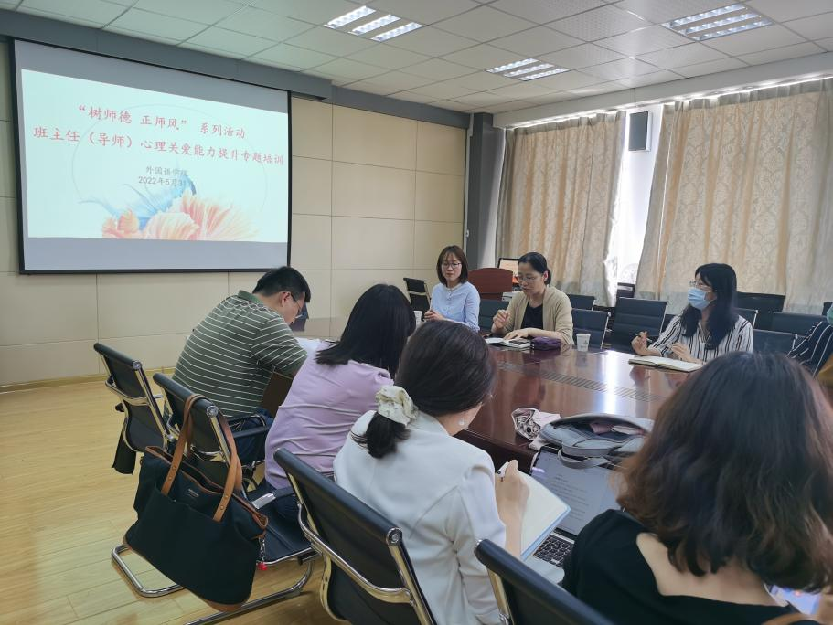 2022年5月31日下午,2026世界杯官网“树师德 正师风”系列活动——教师心理关爱能力提升专题培训在学院517会议室进行,学院邀请校心理健康教育与研究中心主任李海玲为学院全体系部主任、班主任(导师)进行相关培训。