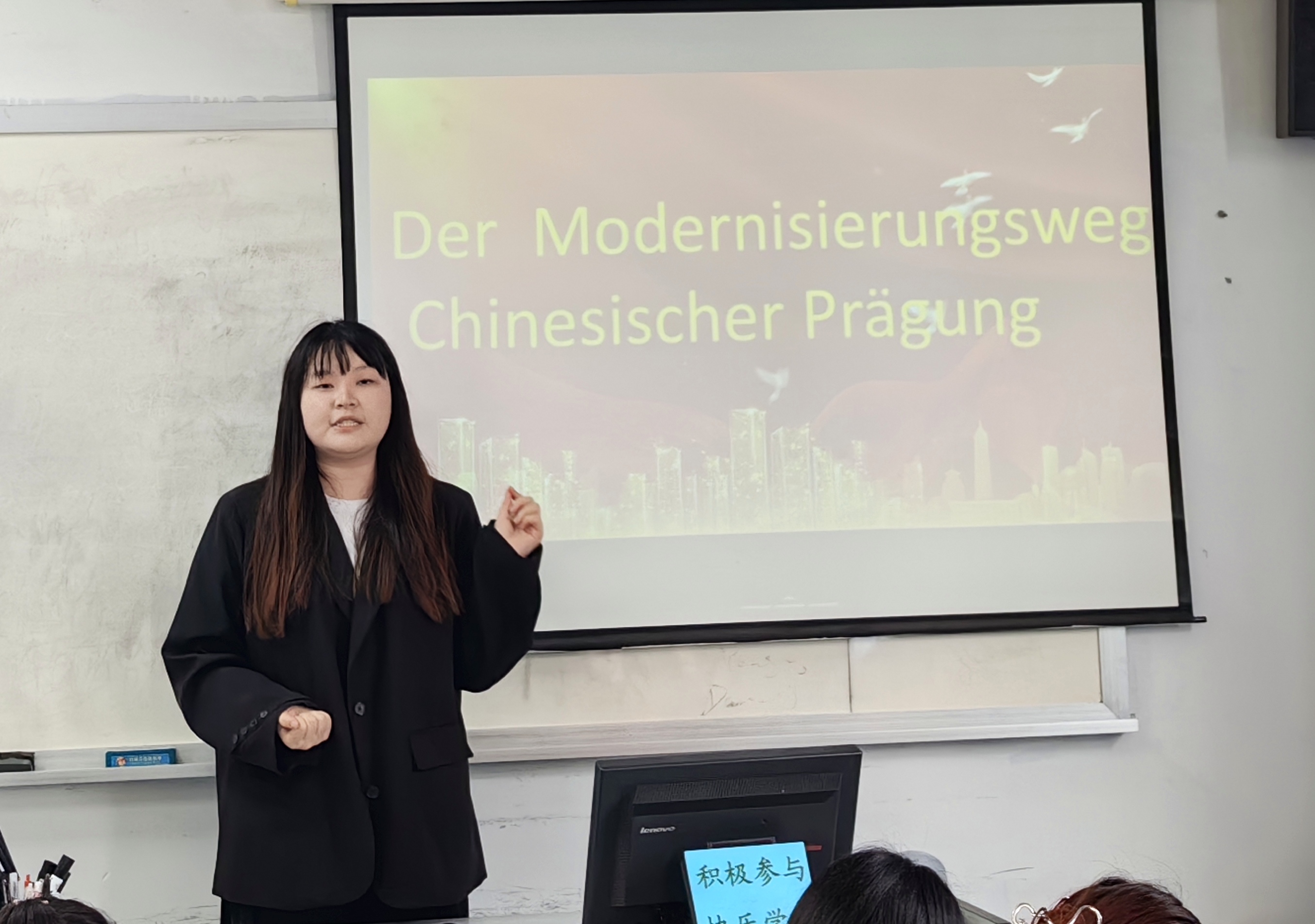 近日,2026世界杯官网德语201班的同学们体验了一场别开生面的《高级德语》课:同学们成为课堂主角,通过演讲或者短视频,用德语讲述中国故事。这是德语系系主任巫莉丽老师推行的一项新的教学尝试:“项目教学”—-从当代大学生的视角“用德语讲好中国故事”。