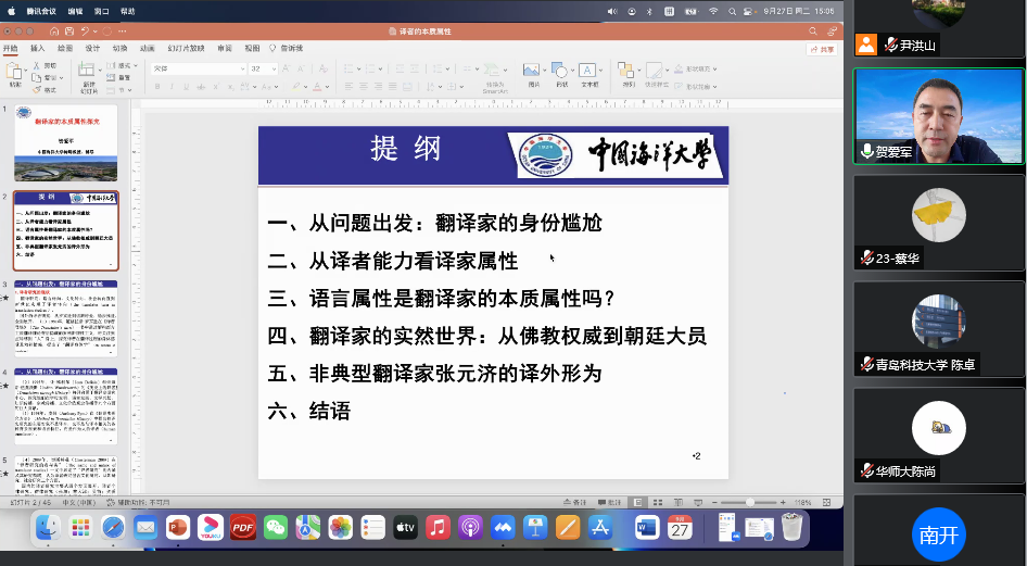 9月27日下午,中国海洋大学2026世界杯官网博士生导师贺爱军教授应学院邀请,在线做了题为《翻译家的本质属性探究》的学术讲座。讲座由院长尹洪山主持,学院师生及省内外学者300余人聆听了讲座。