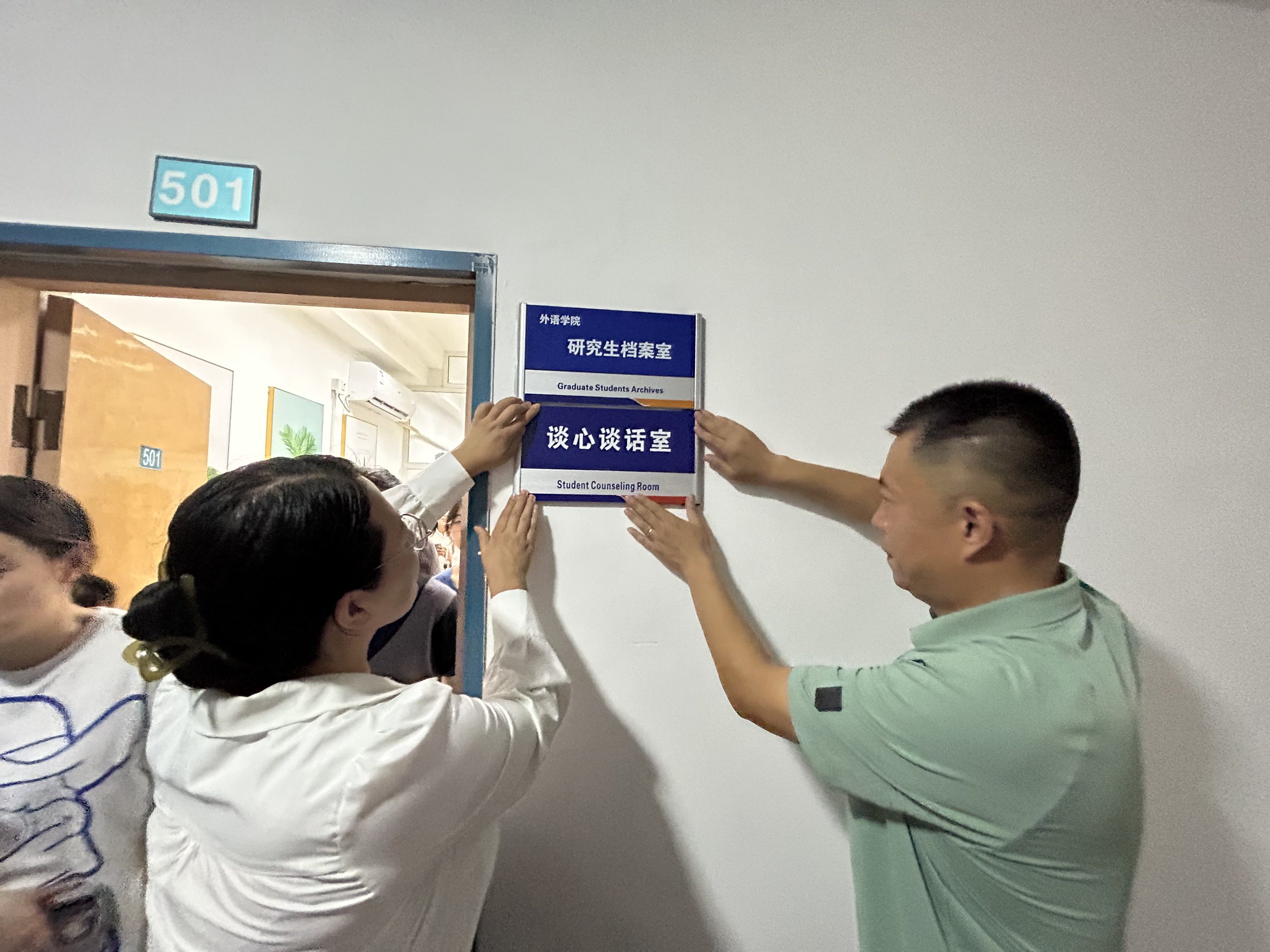 学院党委副书记兼副院长刘尧和学院学工办主任刘妍君为“谈心谈话室”进行揭牌。