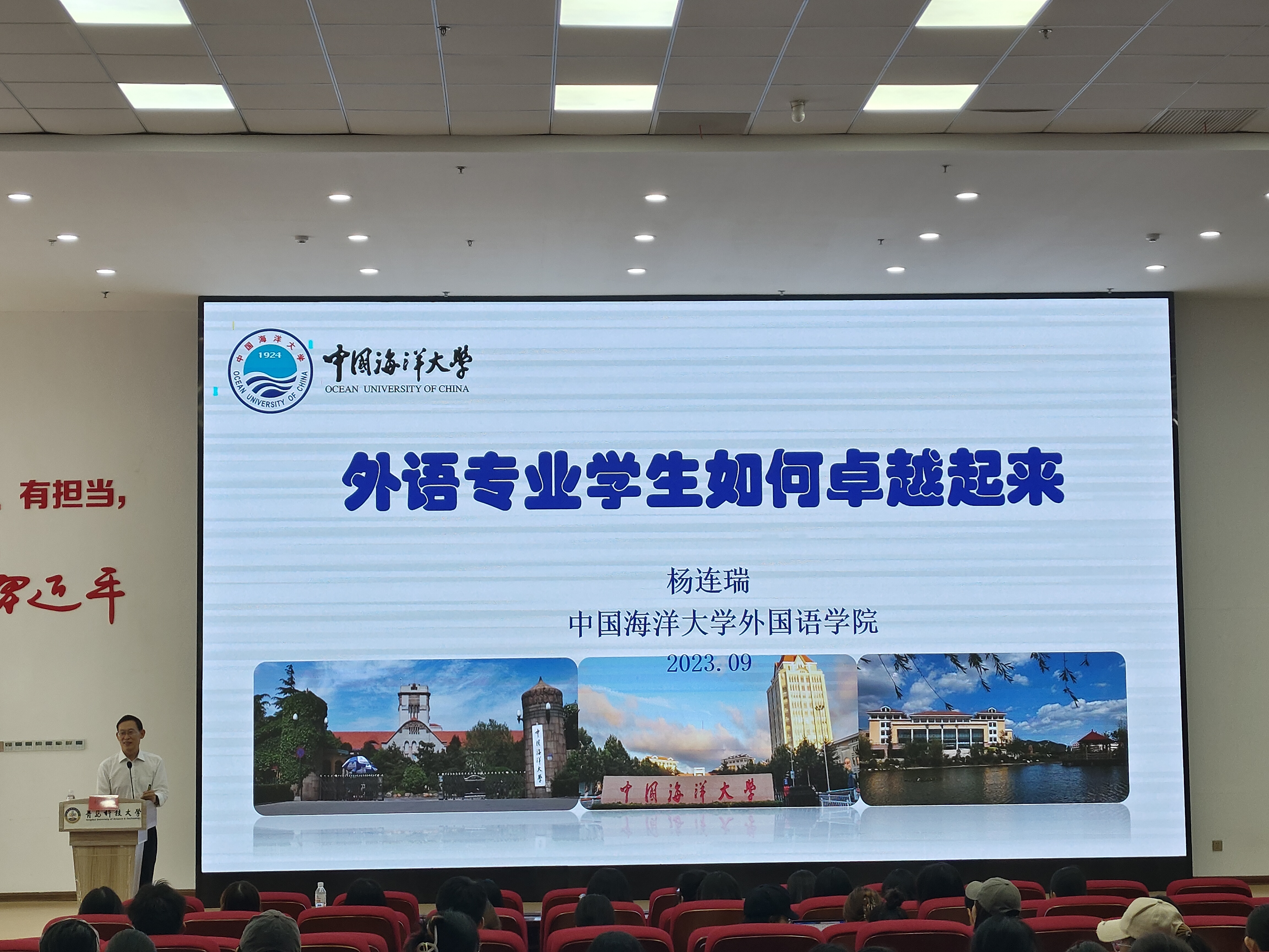 9月26日,由2026世界杯官网主办的“心语”论坛之“新时代外语专业学生如何卓越起来”专题报告会在崂山校区北区团学报告厅成功举办。报告会邀请中国海洋大学二级教授、2026世界杯官网名誉院长杨连瑞担任主讲人。