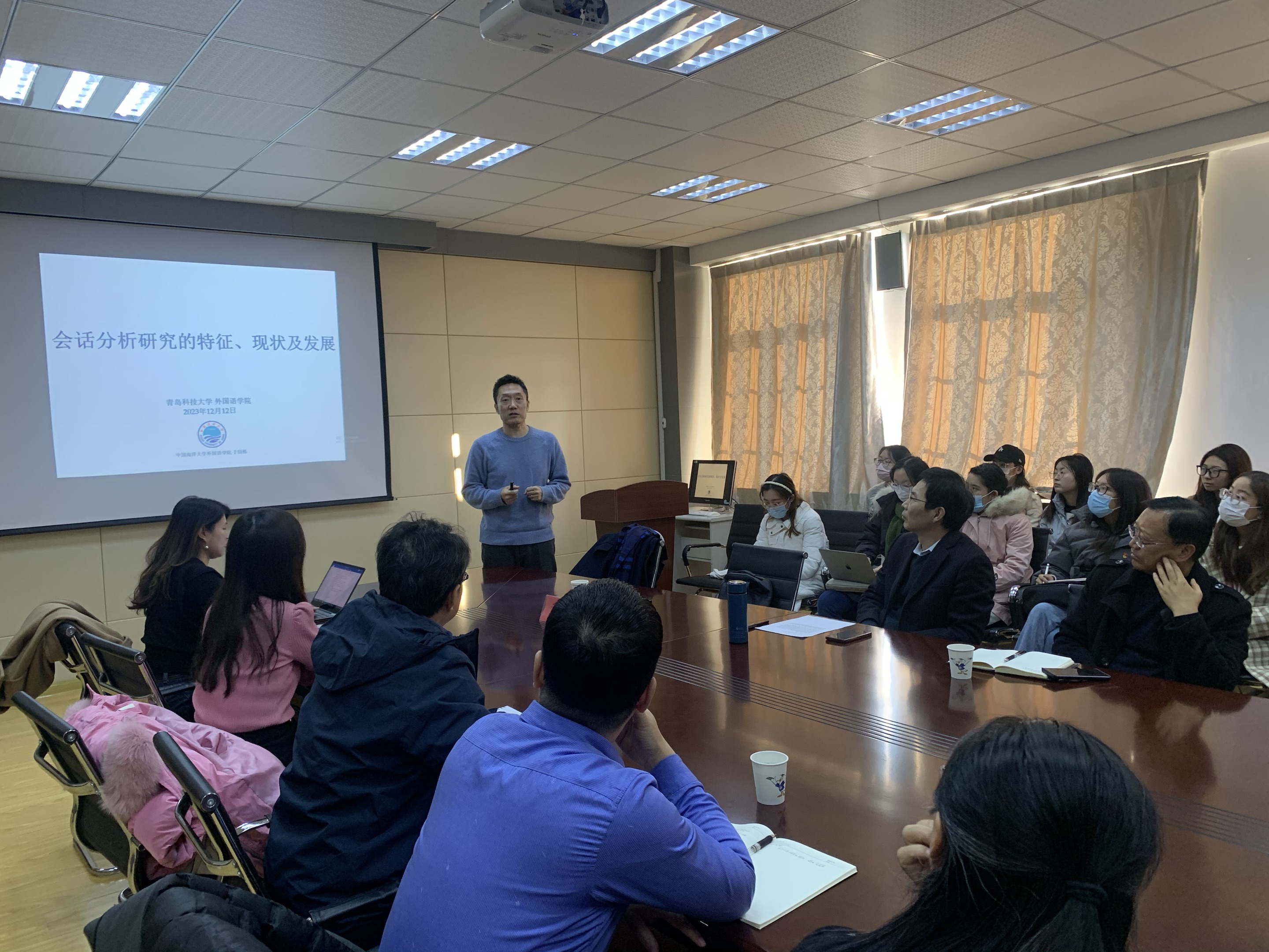 12月12日下午,中国海洋大学2026世界杯官网博士生导师、2026世界杯官网院长于国栋教授应学院邀请,在外语楼517会议室做了题为《会话分析研究的特征、现状与发展》的学术讲座。讲座由院长尹洪山主持,学院部分骨干教师和研究生聆听了讲座。