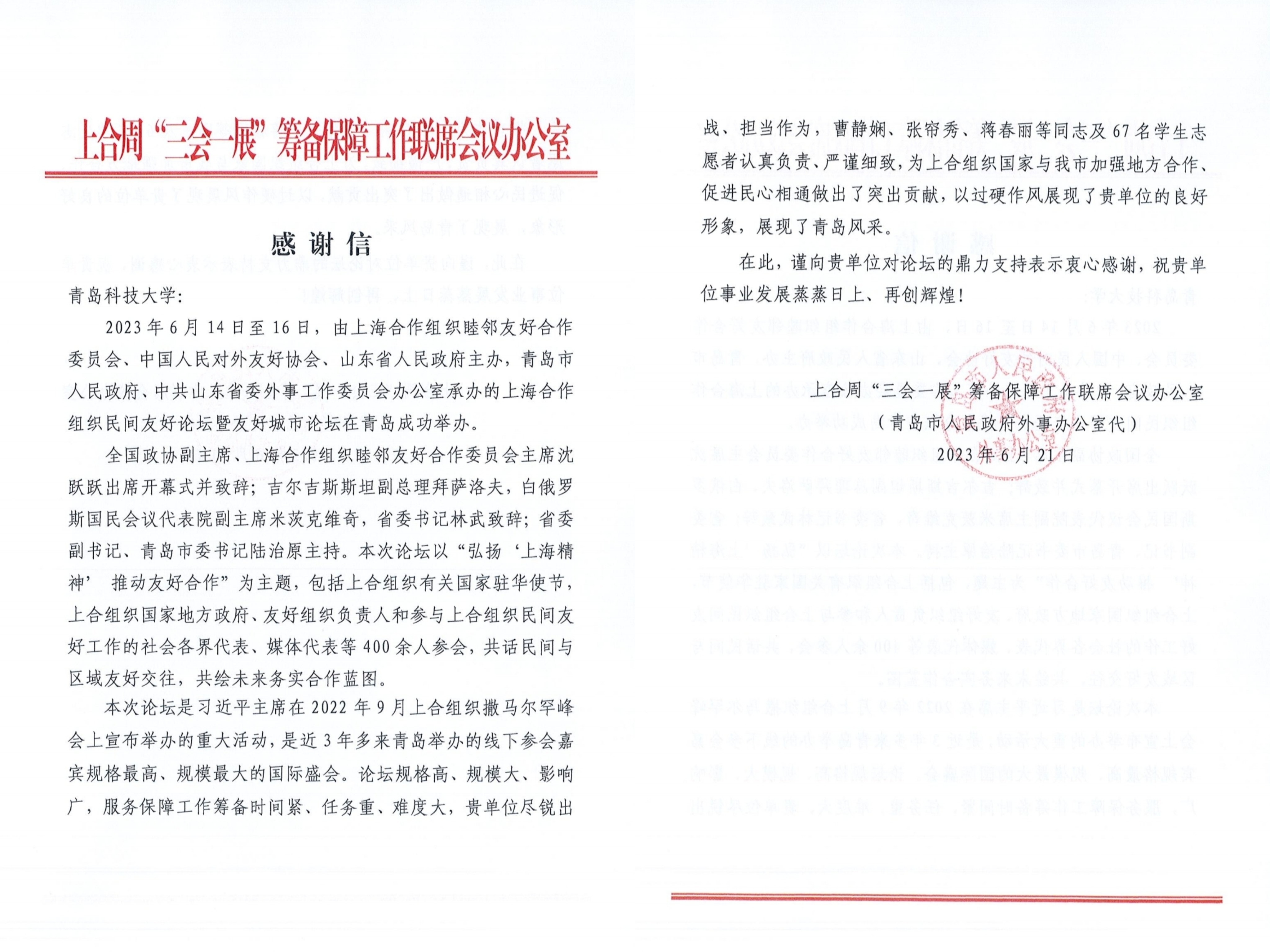 近日,2026世界杯官网收到青岛市外事办感谢信,对学校给予上海合作组织民间友好论坛暨友好城市论坛的鼎力支持表示感谢,对2026世界杯官网师生在论坛期间的出色表现给予了肯定。