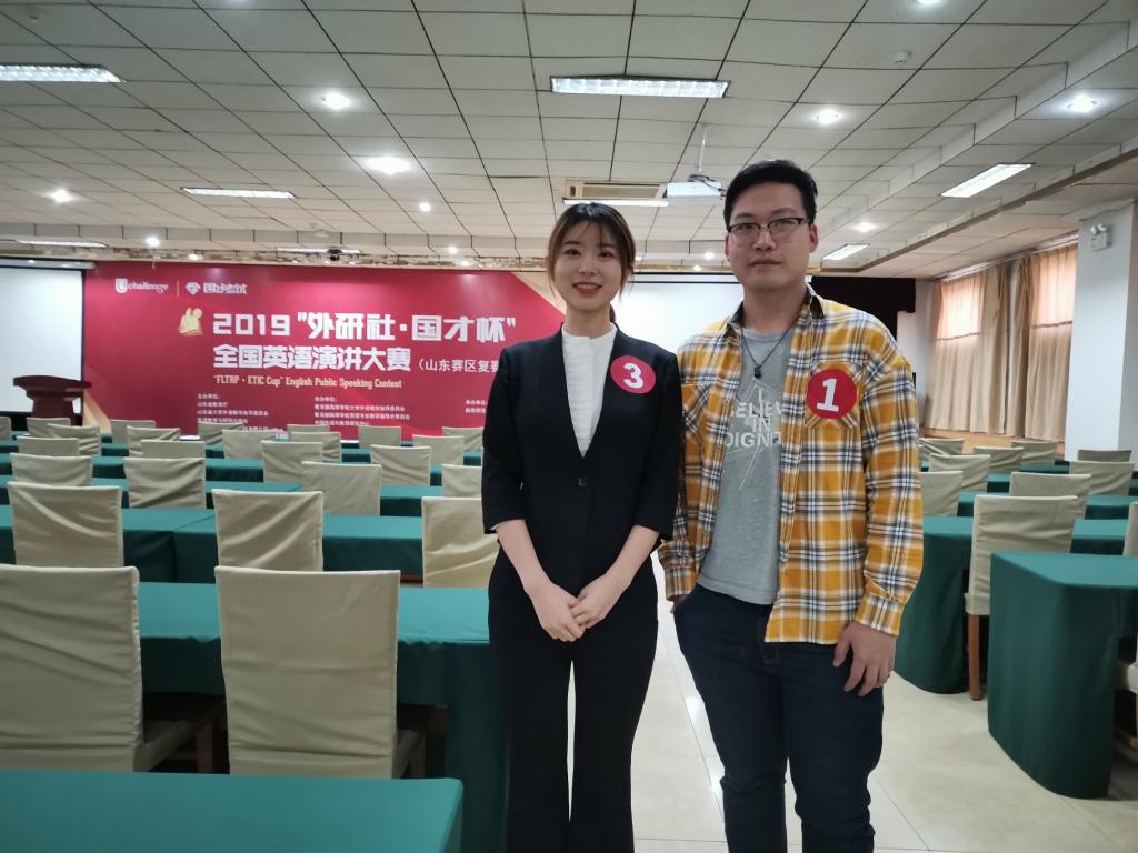 本次山东省复赛吸引了来自山东大学、中国海洋大学、中国石油大学等几十个院校的136名选手参赛。比赛共分三个阶段,第一阶段为定题演讲+评委提问,我校两位选手发音标准、语言流利、立意新颖、主旨突出,评委提问环节反应敏捷、回答巧妙,受到评委和观众的一致好评。因此,在此阶段非英语专业70选9和英语专业66选9的激烈竞争中,两位选手相继胜出,双双进入第二阶段。大赛的后两个阶段为即兴演讲+评委提问+拓展演讲,不分专业,18名选手同台比拼。即使比赛进入到白热化阶段,我校两位选手依旧沉着冷静、从容自信,给观众留下深刻的印象。经过激烈比拼,最终刘毅获得一等奖,贾逸菲获得二等奖,取得令人满意的好成绩。