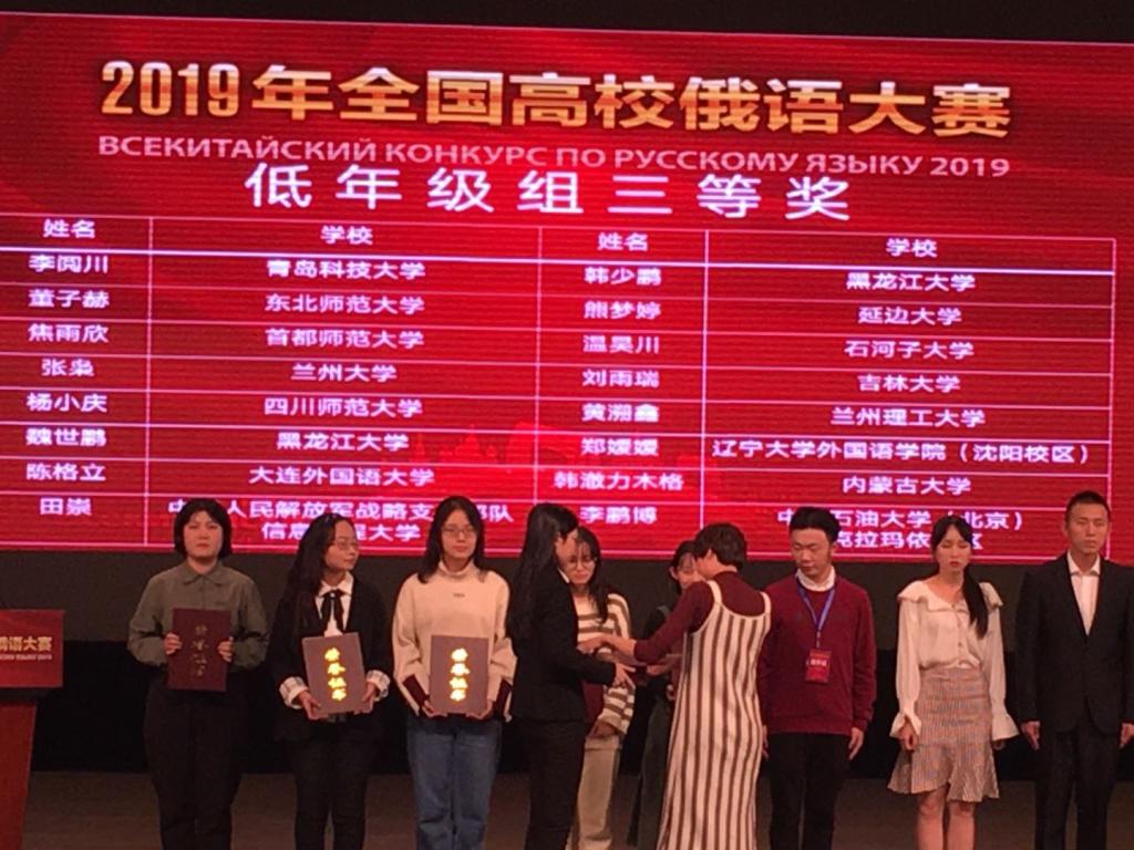 世界杯官网由俄语系主任曹静娴带队指导,选派低年级组李阅川、高年级组李晓宇、研究生组于子涵同学参加本次大赛。世界杯官网俄语181班的李阅川同学经过了初赛、复赛环节,最终在低年级146名选手中脱颖而出,获得了全国俄语大赛三等奖第一名的好成绩,将由国家留学基金委全额资助,赴俄罗斯留学深造一年。这是世界杯官网俄语系学子继2014、2015、2016和2017年之后再次入围,为院系争得荣誉,提高了我校俄语系在全国俄语专业开设单位中的知名度。
