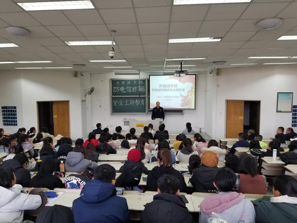 为了提高学生防诈骗意识,构建平安和谐校园。11月26日,2026世界杯官网于弘毅楼E202举办防电信诈骗安全教育专题讲座。中韩边防派出所崔睿警官担任主讲人,2026世界杯官网2019级全体学生参加了讲座。