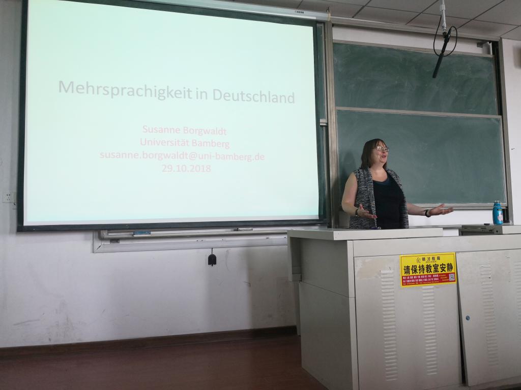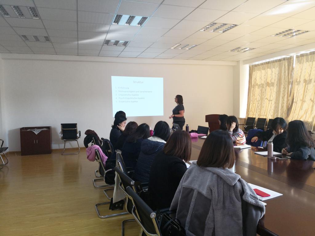 10月27日至11月3日,德国班贝格大学Susanne Borgwaldt教授应邀在世界杯官网进行了为期一周的访学,期间共举办了三场学术报告,主题分别为《德国的多语化(Mehrsprachigkeit in Deutschland)》、《德语构词法之复合词(Wortbildung-Komposition)》和《二语习得研究心得(L2-Erwerb)》,并围绕《多语化和第三语教学(Mehrsprachigkeits- und Tertiärsprachendidaktik)》这一主题开展了为期三天的教师培训,2026世界杯官网德语系全体教师及部分中德科技学院、中德双元工程学院的德语教师参加了此次培训。经过一周的学习与交流,师生们都感到受益颇丰。