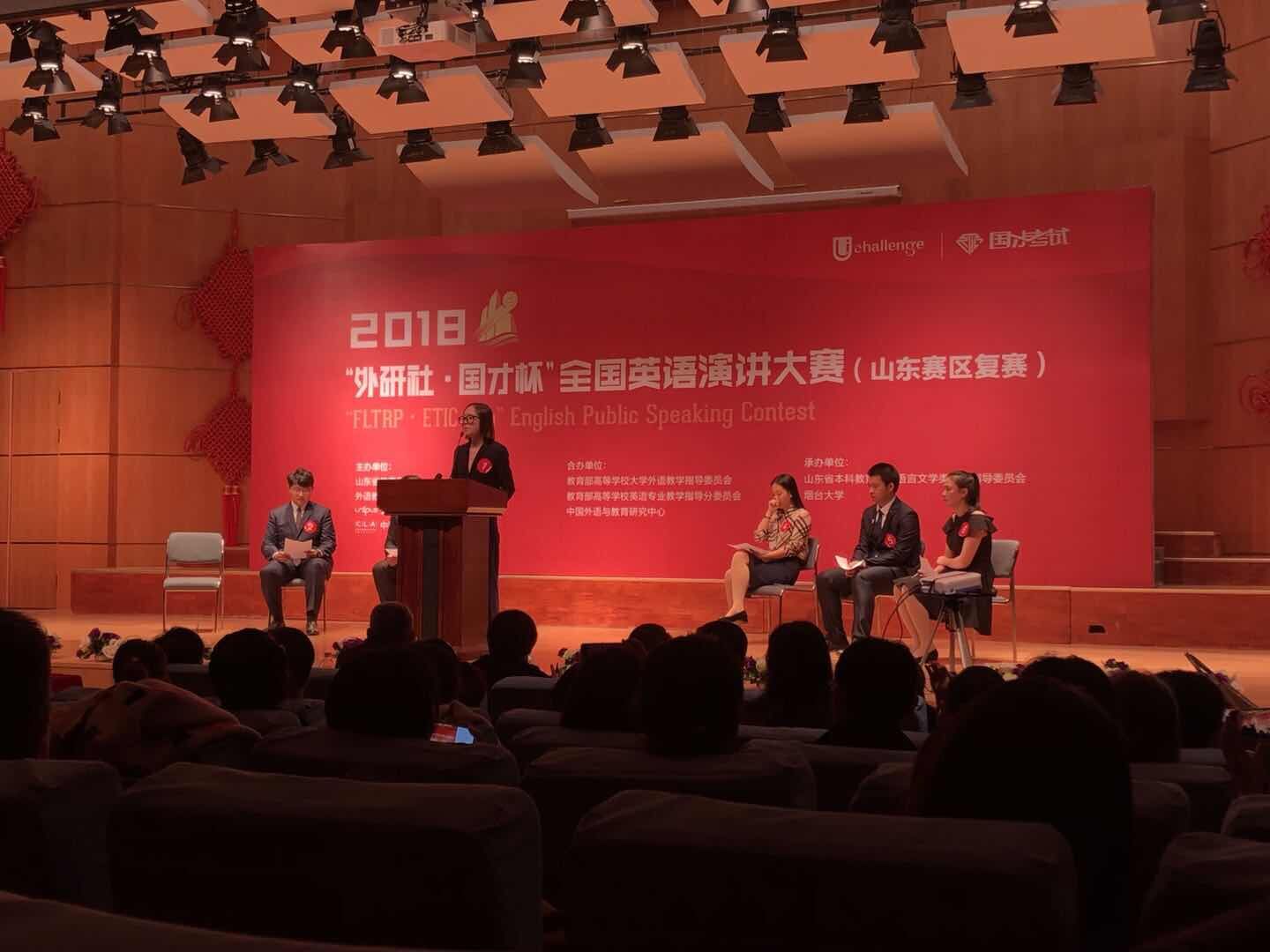 本次比赛汇集了来自全省各地的英语达人,参赛选手均为各高校校内选拔赛中的佼佼者。大赛共分为三轮。第一轮为3分钟的有备演讲与1分钟的评委提问;第二轮为3分钟的即兴演讲,1分钟的评委提问与综合知识竞答;第三轮为2分钟的即兴演讲,1分钟的评委提问与1分钟的拓展演讲。有备演讲是关于摸着石头过河的主题演讲,即兴演讲赛题紧扣时代特征,是对选手思辨能力、临场应变能力、语言表达能力的巨大挑战。比赛的气氛紧张激烈,选手的得分不相上下,观众的喝彩声接连不断。来自山东各高校的老师与同学齐聚一堂,共睹选手风采。蒋嘉颖以她沉着冷静,妙语连珠的演讲风格以及精彩的定题演讲内容以总分第一名的成绩进入第二轮比赛,经过第二轮比赛和第三轮比赛,蒋嘉颖出色的即兴演讲能力、回答问题能力和综合知识储备能力获得了现场评委的一致认可,最终获得省一等奖的好成绩。