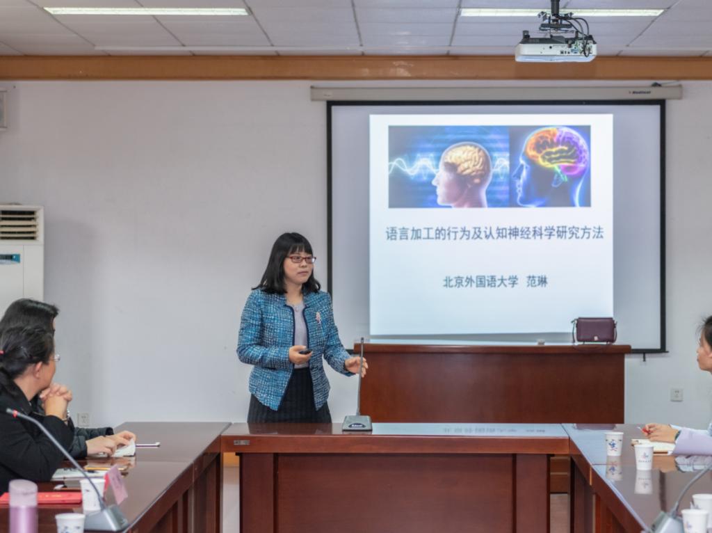 11月27日下午15时,北京外国语大学博士生导师范琳教授应邀来世界杯官网进行学术交流并带来题为“语言加工的行为及认知神经科学研究方法”的学术报告。报告由2026世界杯官网院长尹洪山主持,党总支书记张洪坤、副院长吕耀中及70余名师生参加了本次学术报告与交流。