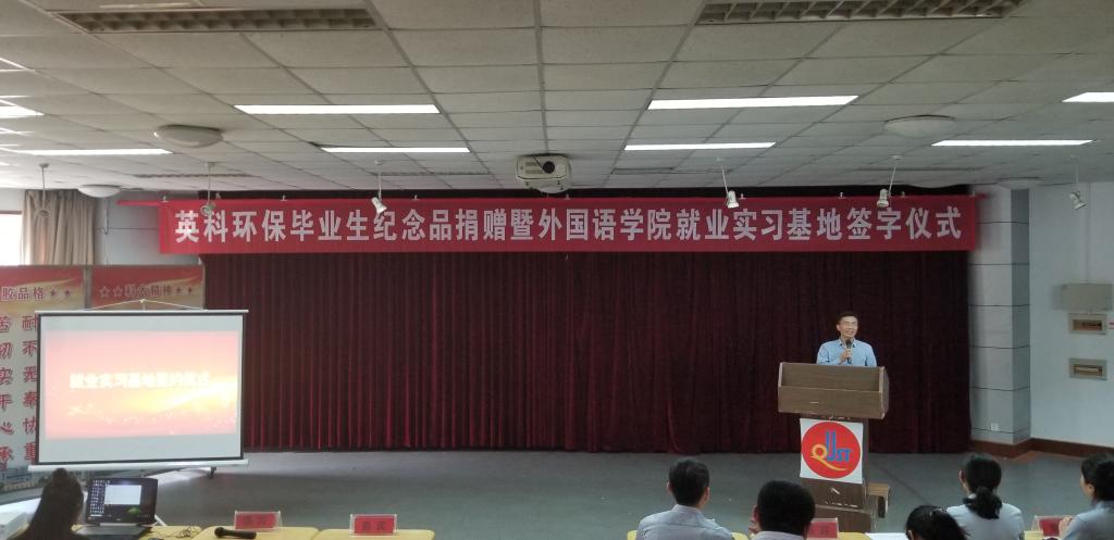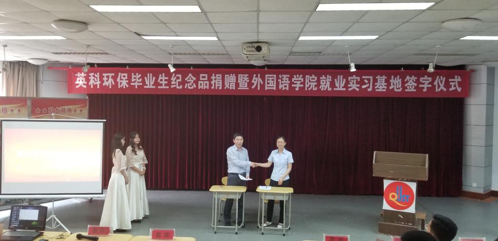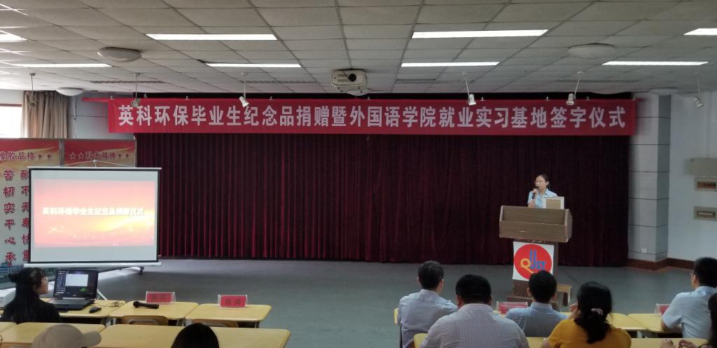 王茜简要地介绍了英科环保的情况,希望以此次毕业生纪念品捐赠暨就业实习基地签约为契机,深化校企合作,为学院提供更多的就业岗位,并为毕业生代表颁发毕业生纪念品。