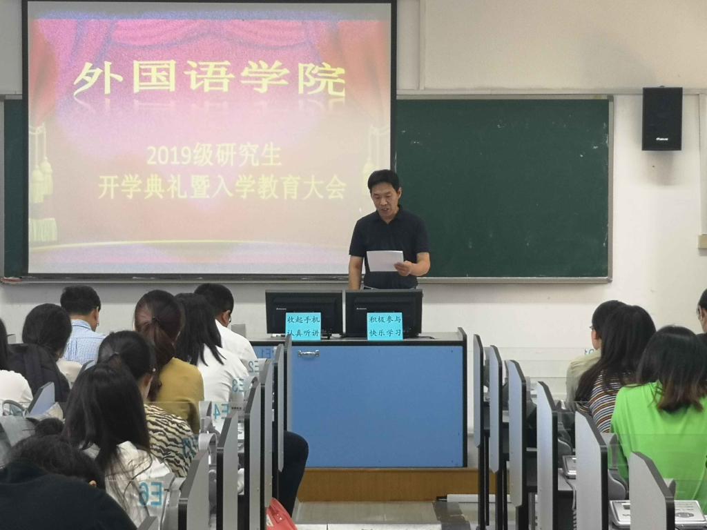 大会开始,尹洪山院长对2019级研究生表示了由衷的祝贺和热烈的欢迎。接着,尹洪山从学院发展历史、系部设置等方面简要介绍了学院发展情况,他提出研究生的重点在于研究,并从“研究什么”、“怎么研究”两个方面强调了研究生要以科研学术为主,培养科研创新的能力,恪守学术道德,努力成为专业知识精深的优秀外语研究人才。
