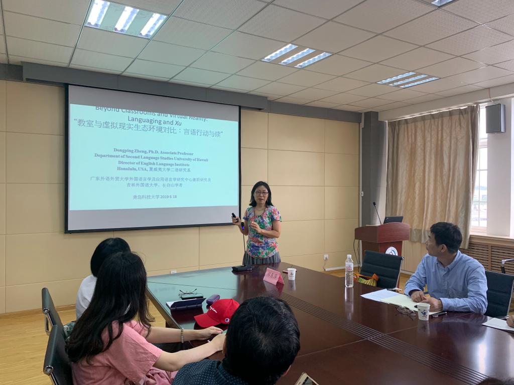 6月18日下午,美国夏威夷大学二语研究系教授,博士生导师郑东萍应世界杯官网邀请,在外语楼517会议室做了题为《教室与虚拟现实生态环境对比:言语行动与续》的报告。报告会由院长尹洪山教授主持,院长助理刘靖及部分教师和研究生参加了报告会。