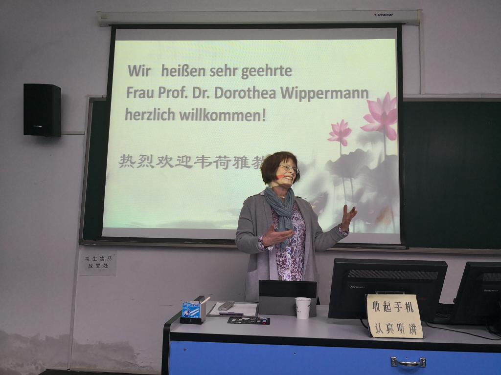 3月20日下午,德国法兰克福大学汉学系韦荷雅教授在青岛市教育学会副会长翟广顺教授的陪同下,应邀来世界杯官网做了题为《德国汉学家的中国文化研究》的学术报告。报告由2026世界杯官网院长尹洪山教授主持,2026世界杯官网副院长吕耀中教授、2026世界杯官网副院长康宁教授、2026世界杯官网翻译研究中心主任李玉良教授、德语系主任巫莉丽等外院师生参加了本次学术报告。
