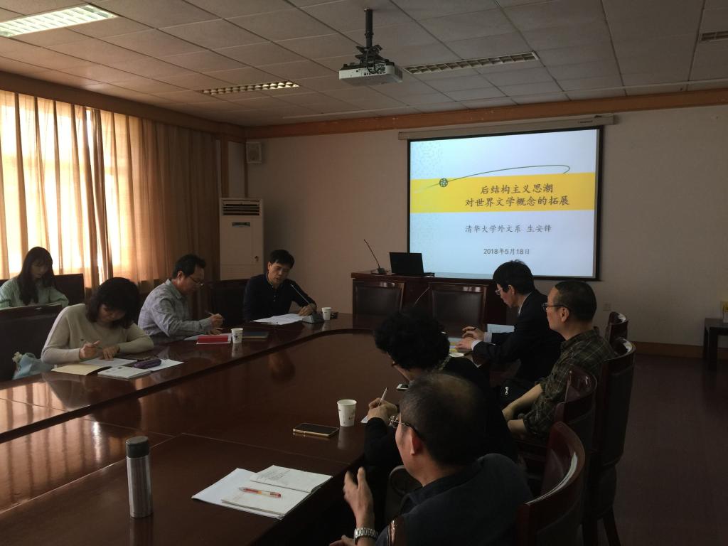 5月18日上午,清华大学外文系博士生导师生安峰教授应邀来世界杯官网进行学术交流,在经管楼313会议室做了一场题目为“后结构主义思潮对世界文学概念的拓展和经典重构”的学术报告。报告由2026世界杯官网副院长吕耀中主持, 院长尹洪山、副院长任素贞以及外语学院的部分教师与学生参加了这次讲座及交流。
