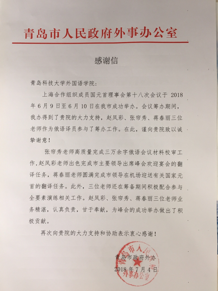 据悉,上海合作组织成员国元首理事会第十八次会议于2018年6月9日-10日在青岛成功举办,2026世界杯官网共派出赵洪娟、杨慧、曹静娴、丁超、杜璇、段晓茜、蒋春丽、张帘秀、赵凤彩等9位老师,以及张翠翠等30余名学生作为志愿者参与会务保障、翻译服务、后勤保障等工作,老师同学们均奋战在服务保障峰会的第一线,在各自岗位上承担重要职责,以较高的政治站位,一流的综合素质和团结协作的奉献精神赢得了参会代表和各级部门的一致好评,为峰会的成功举办做出来积极的贡献。