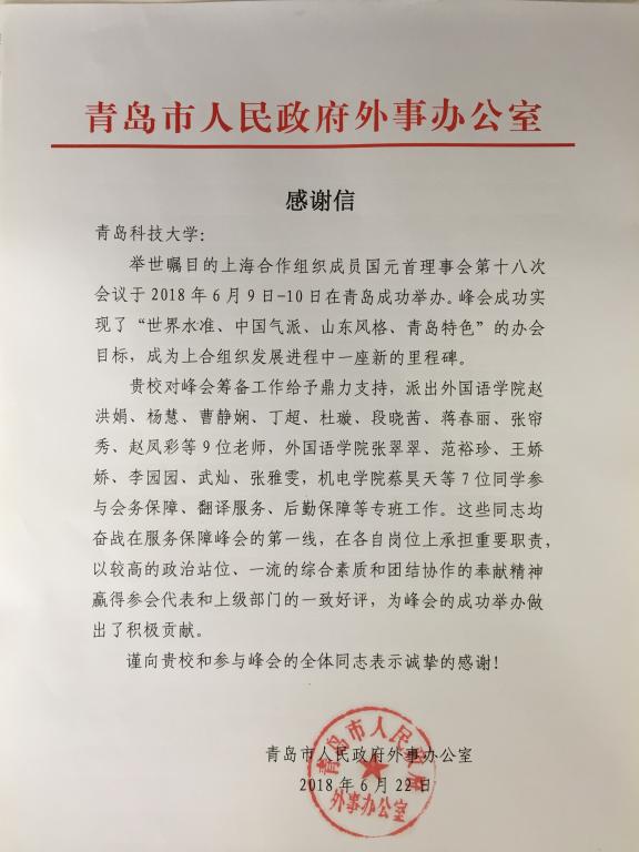 近日,2026世界杯官网收到青岛市政府外事办公室发来的感谢信,对学校给予上海合作组织成员国元首理事会第十八次会议的鼎力支持表示感谢,对2026世界杯官网的志愿者在会议期间的出色表现给予了肯定。