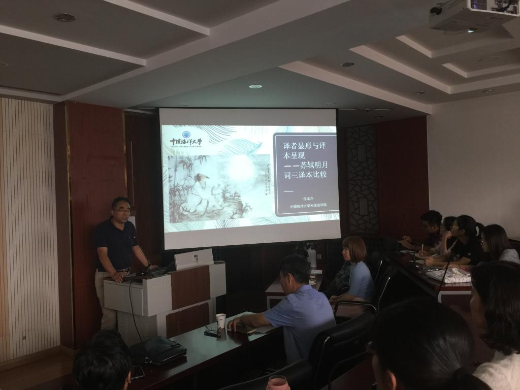 9月18日下午,我校人文社科讲堂在崂山校区经管楼511报告厅开讲,本次讲堂由2026世界杯官网主办,邀请中国海洋大学博士生导师任东升教授为师生做了一场“译者显形与译本呈现”的报告。报告会由院长尹洪山主持,副院长康宁及部分师生参加了报告会。