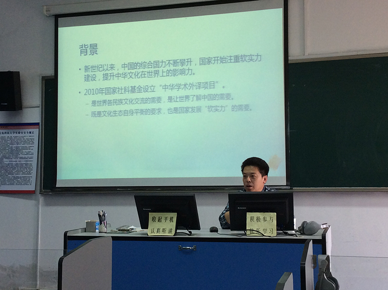 2017年5月16日下午,山东师范大学外语学院英语系主任、翻译硕士中心主任徐彬做客2026世界杯官网研究生论坛,在语音室418做了题为“计算机辅助翻译在中国文化外译中的作用”的学术报告。报告由副院长吕耀中教授主持,姜德杰书记、尹洪山院长、康宁副院长及学院部分师生到场参加。
