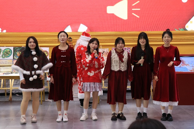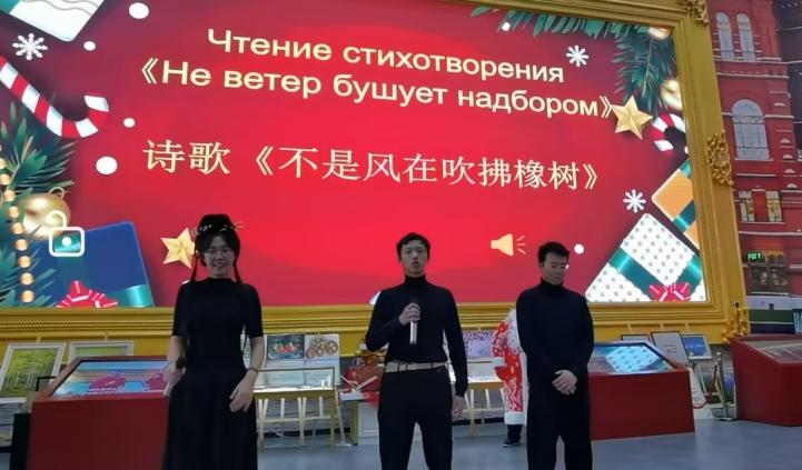 俄语系学生为新年庆典带来了《обними меня》(拥抱我)、《Вечера》(夜晚)、《Весна》(春天)等俄罗斯歌曲,《Дело было в январе》(事情发生在一月)、《Не ветер бушует надбором》(不是风在吹拂橡树)《А давай по Новогоднему закону》(让我们遵循新年的法则)等俄语诗歌朗诵。