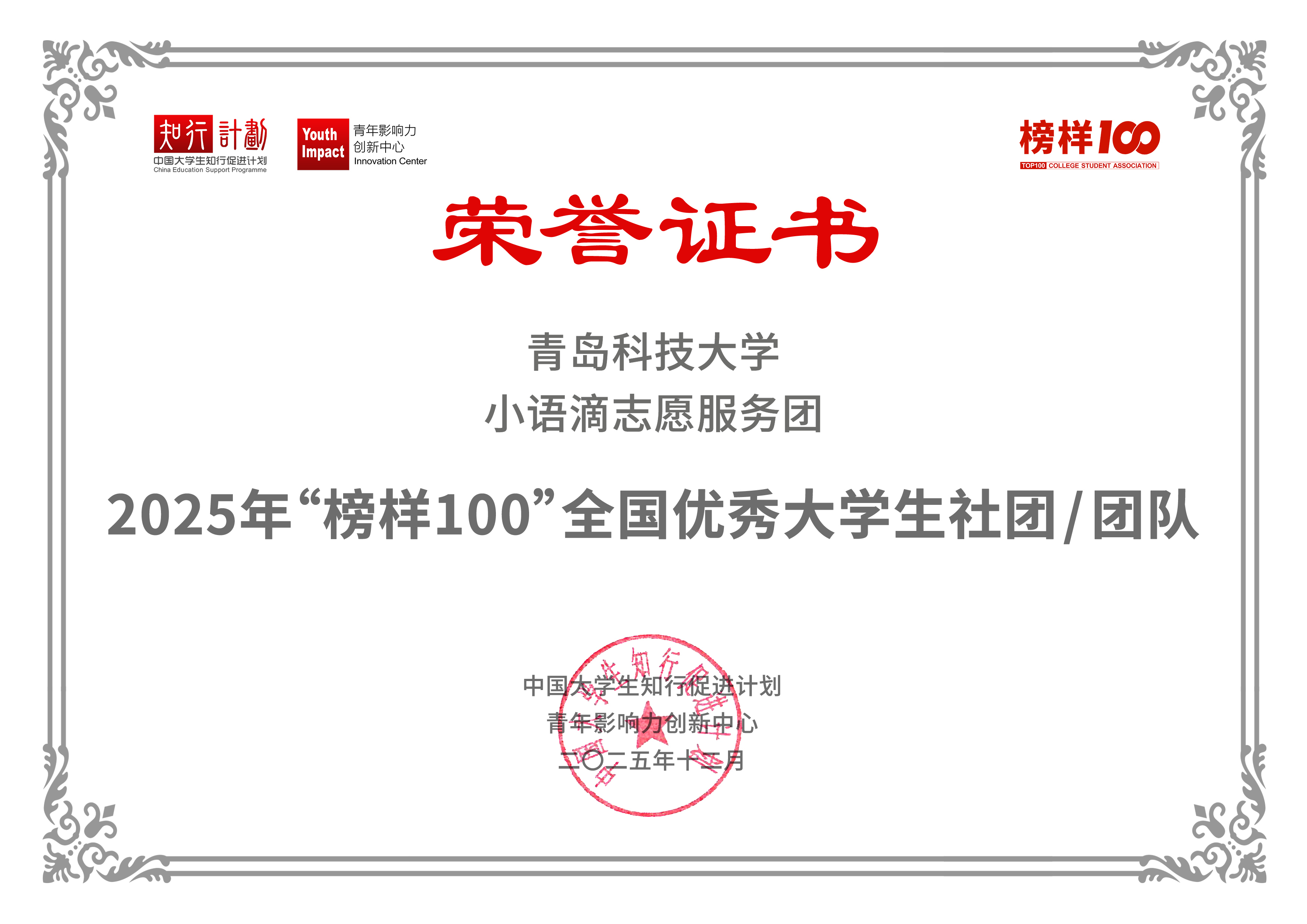近日,2025年“榜样100”全国优秀大学生社团及团队(第二批)榜单正式发布。该榜单由中国大学生知行促进计划与青年影响力创新中心联合发布,全国共有376所高校的1320支团队参与申报。世界杯官网“小语滴”志愿服务团凭借扎实的服务成效和突出的社会影响力,在激烈竞争中脱颖而出,展现出世界杯官网青年志愿服务的卓越风采。