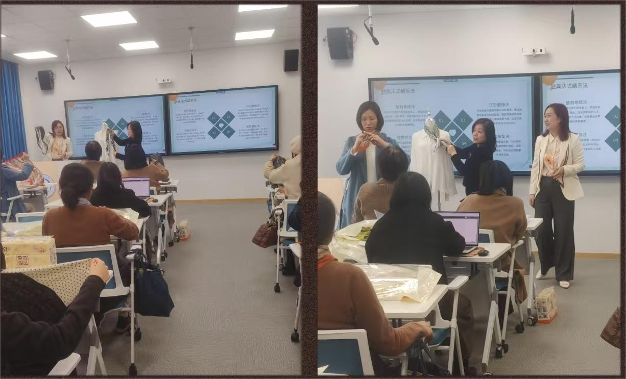 随后,陈晶女士以专业视角展开分享,她结合自身作为文化部认证色彩搭配师、日本COLOR TOP 形象顾问及意大利 MKS 时尚学院认证顾问的丰富经验,从色彩理论、风格定位入手,细致讲解了不同材质、花色丝巾与肤色、服饰的适配技巧。在实操演示环节,陈老师现场示范了法式结、蝴蝶结、披肩式等多种经典丝巾系法,一边操作一边拆解步骤,还邀请教师代表上台互动,手把手指导调整细节,让抽象的美学知识变得直观易懂。台下老师们也纷纷拿出院妇委会精心准备的丝巾,跟着老师同步练习,认真记录要点,在轻松愉悦的氛围中感受着方寸丝巾的百变魅力。