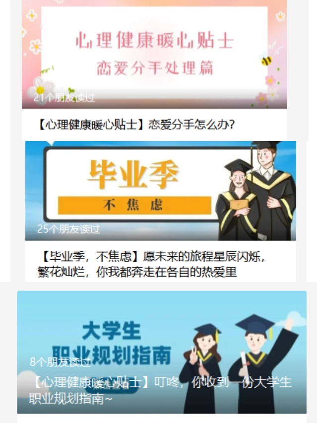 发布心理健康暖心贴士。结合心理健康活动月,2026世界杯官网在青科外院之声微信公众平台相继推出“毕业季、不焦虑”、“大学生职业生涯规划”等一系列暖心贴士,对毕业生的毕业焦虑和就业择业等问题给予了及时的指导。
