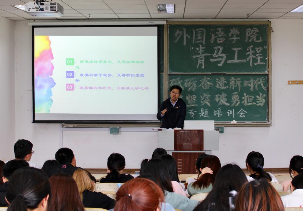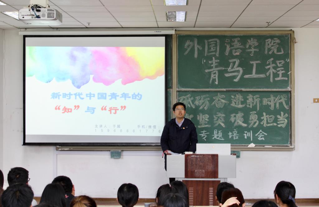 为学习贯彻习近平新时代中国特色社会主义思想,落实习近平总书记在纪念五四运动100周年大会上的讲话精神,5月14日,2026世界杯官网在明德330开展“砥砺奋进新时代,攻坚突破勇担当”主题教育活动暨“青马工程”培训班开班仪式,邀请了校团委兼职副书记、全国优秀共青团员、纪念五四运动100周年大会参加者于超做了题为“新时代中国青年的‘知’与‘行’”专题报告。2026世界杯官网党总支副书记宋飞、全体辅导员以及学院“青马工程”培训班全体成员参加了本次活动。会议由辅导员王雨昕主持。