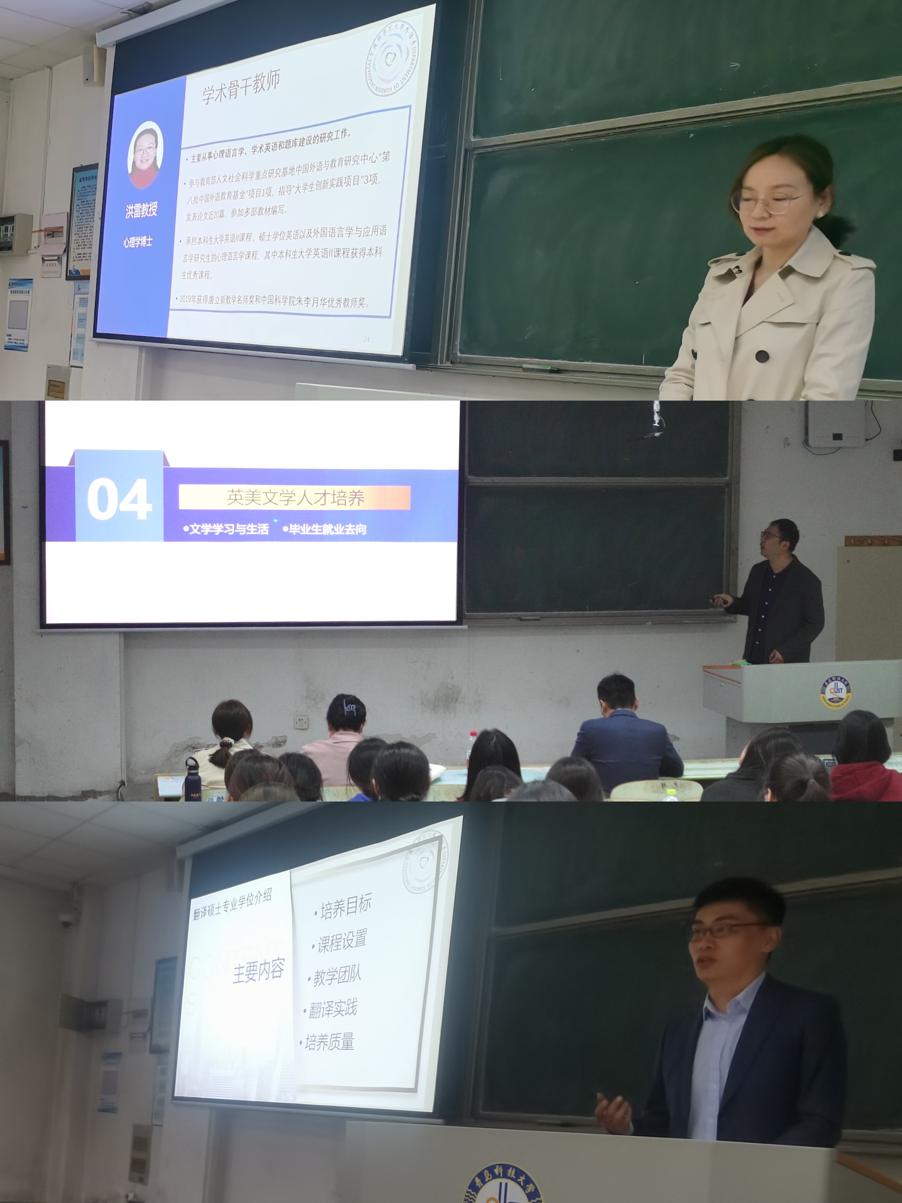 国科大是国家“双一流”建设高校,是一所以科教融合为办学模式、研究生教育为办学主体、精英化本科教育为办学特色的创新型大学。本次招生宣讲活动,李晰老师从整体上介绍了中国科学院大学外语系的发展历史和学院建设基本情况,三位老师分别从培养目标、课程开设、教学团队、研究成果、人才培养等方面介绍了外语系语言学、英美文学和翻译硕士专业的招生培养情况。