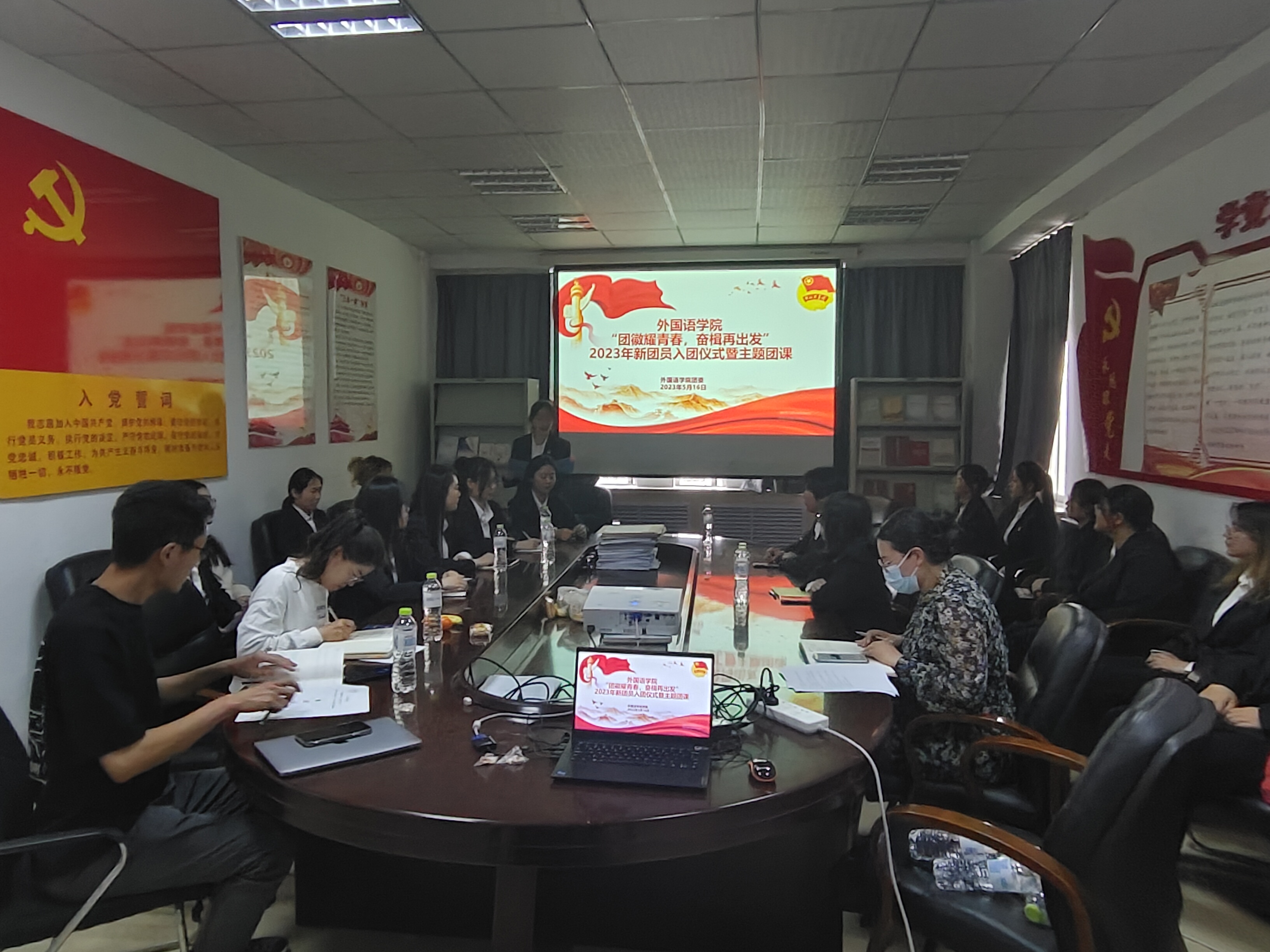 新时代造就新青年。为激励广大团员传承红色基因、铸牢理想信念、勇担时代重任,坚定不移听党话、跟党走,努力成长为堪当民族复兴重任的时代新人,5月16日17:00,2026世界杯官网团委在学院楼502会议室举行“团徽耀青春,奋楫再出发”主题团课暨2023年新发展团员入团仪式。出席本次活动的有学院全体团委老师,两位新团员以及2022级全体班长、团支书。