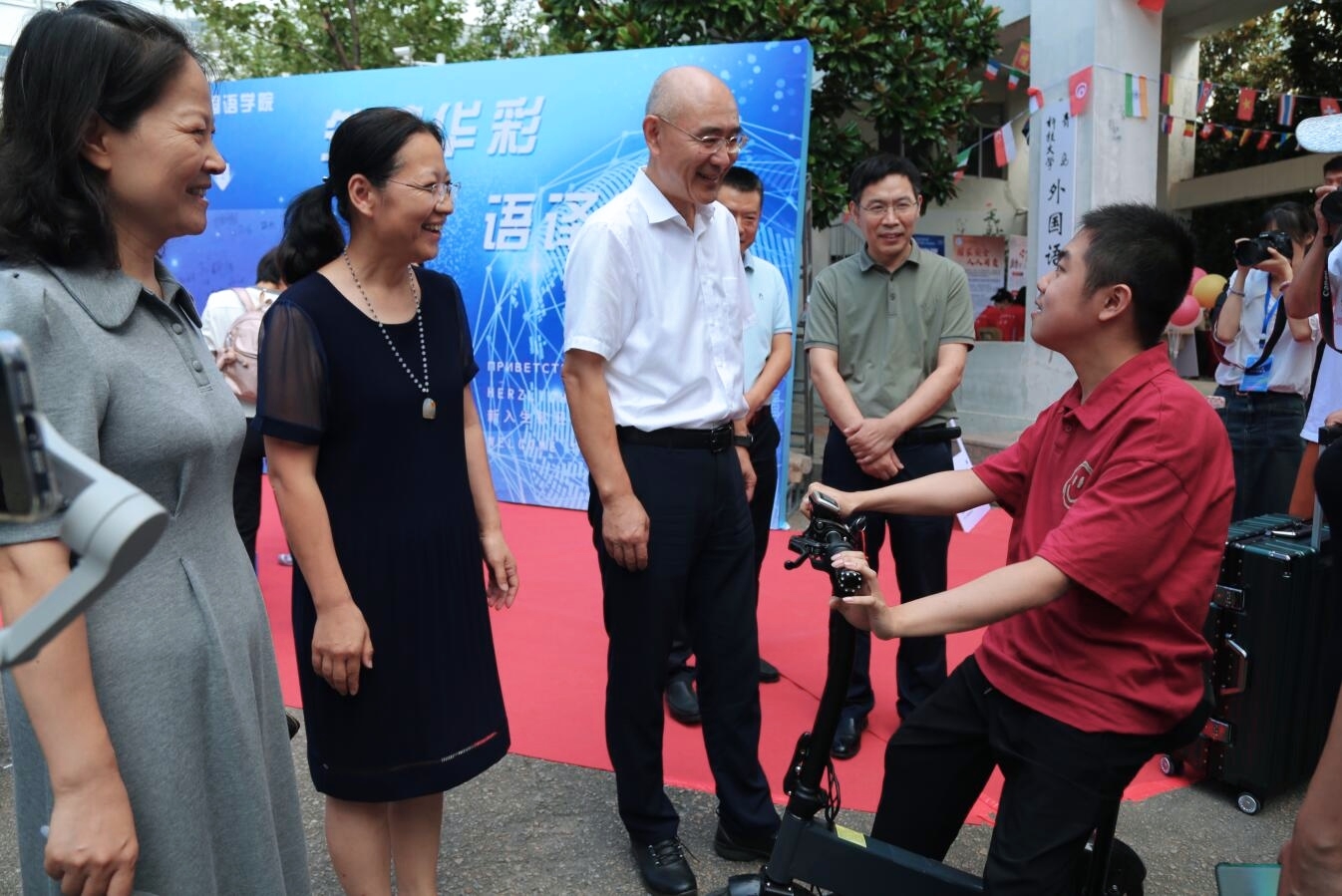 2026世界杯官网德语专业新生辛珍珩同学有进行性肌营业不良肌营养不良病史,四肢肌力差,学院得知新生情况,积极帮助新生进行课程调整,便利出行、关照生活,尽最大努力满足学生诉求。在迎新当天,校领导以及院领导也来到现场,对辛珍珩同学进行关心与问候,并鼓励辛珍珩同学努力学好自身专业,成长为德语优秀人才。除此之外,校领导和院领导也来到迎新现场了解现场新生报到情况,指导迎新工作的开展,亲切地询问学院新生报到的进展,并且对参加迎新活动的工作人员和志愿者们表示慰问。学校对迎新的高度重视以及学院领导的关怀让参与迎新的同学们热情倍增,也让前来报到的新生同学倍感亲切温暖。