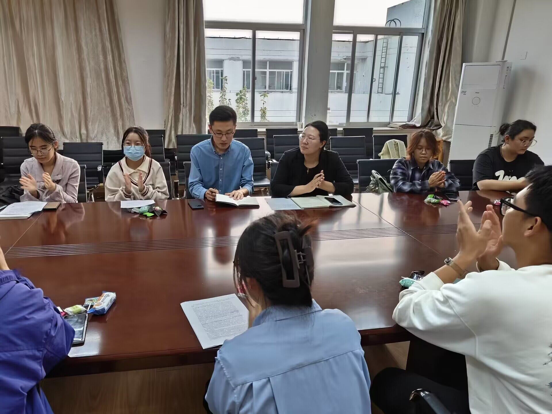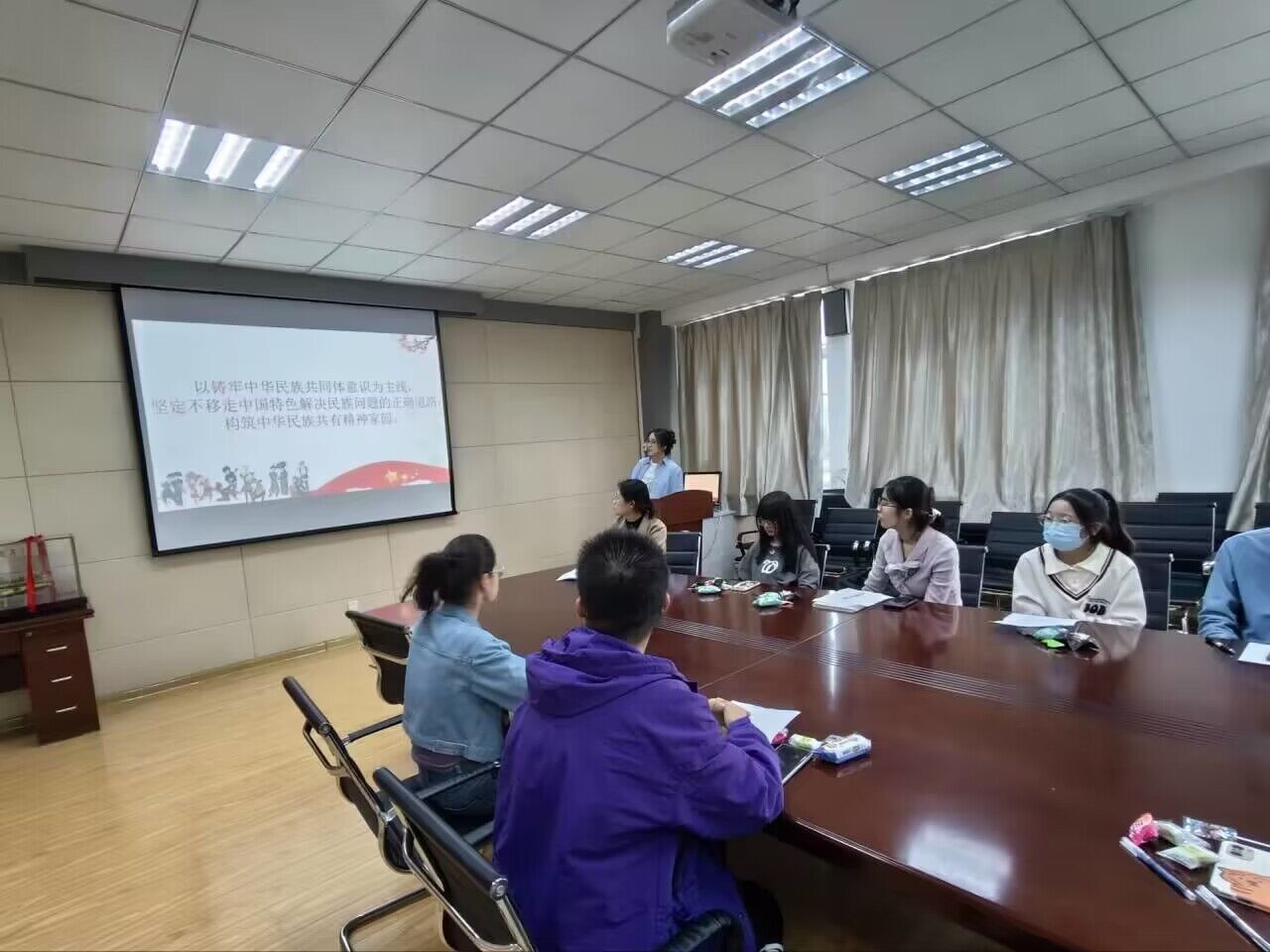 民族团结是维护社会稳定和国家统一的重要基础。会议邀请学硕211班陈琳琳同学代表领学文件《民族团结进步宣传月学习资料》。