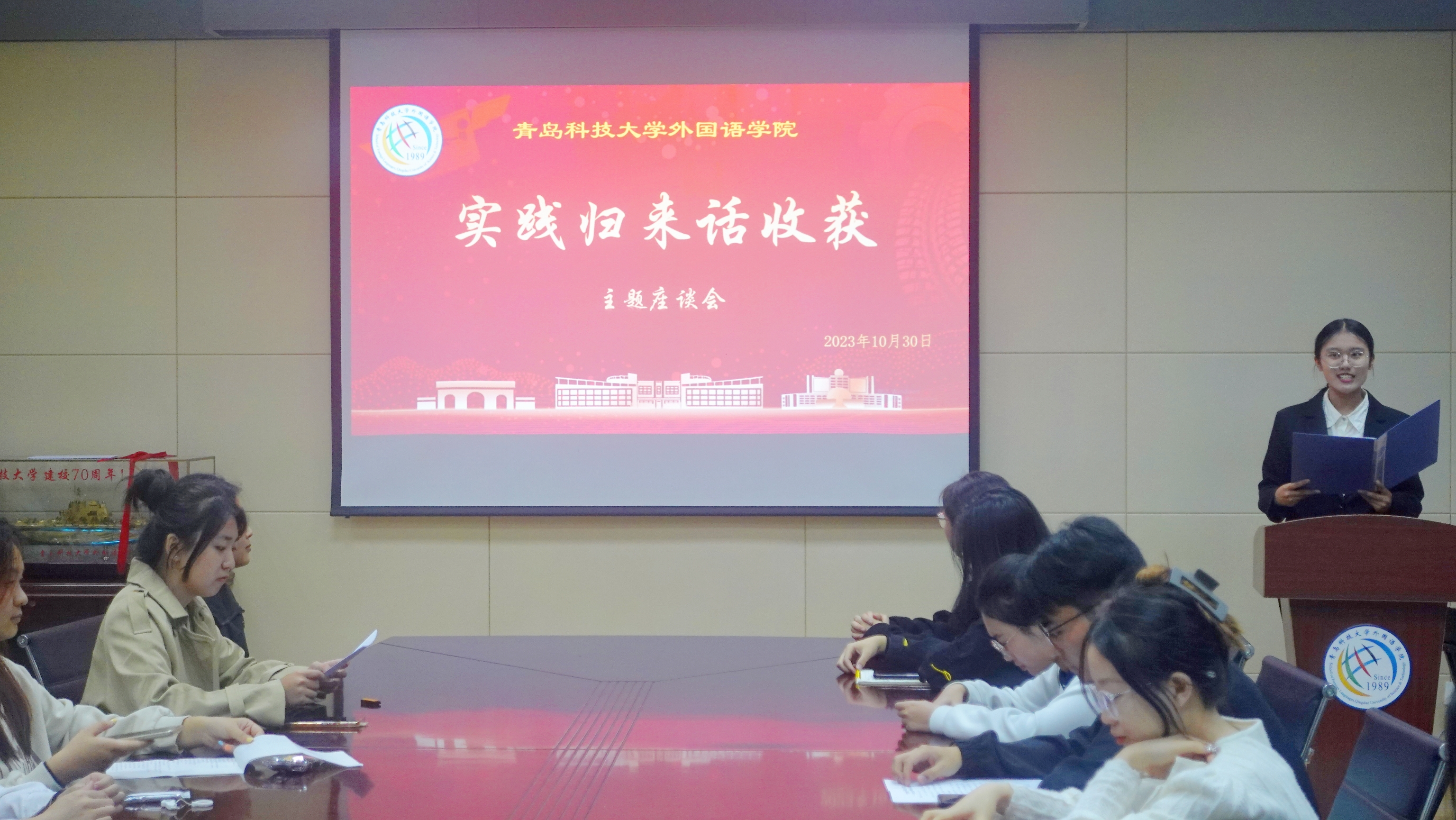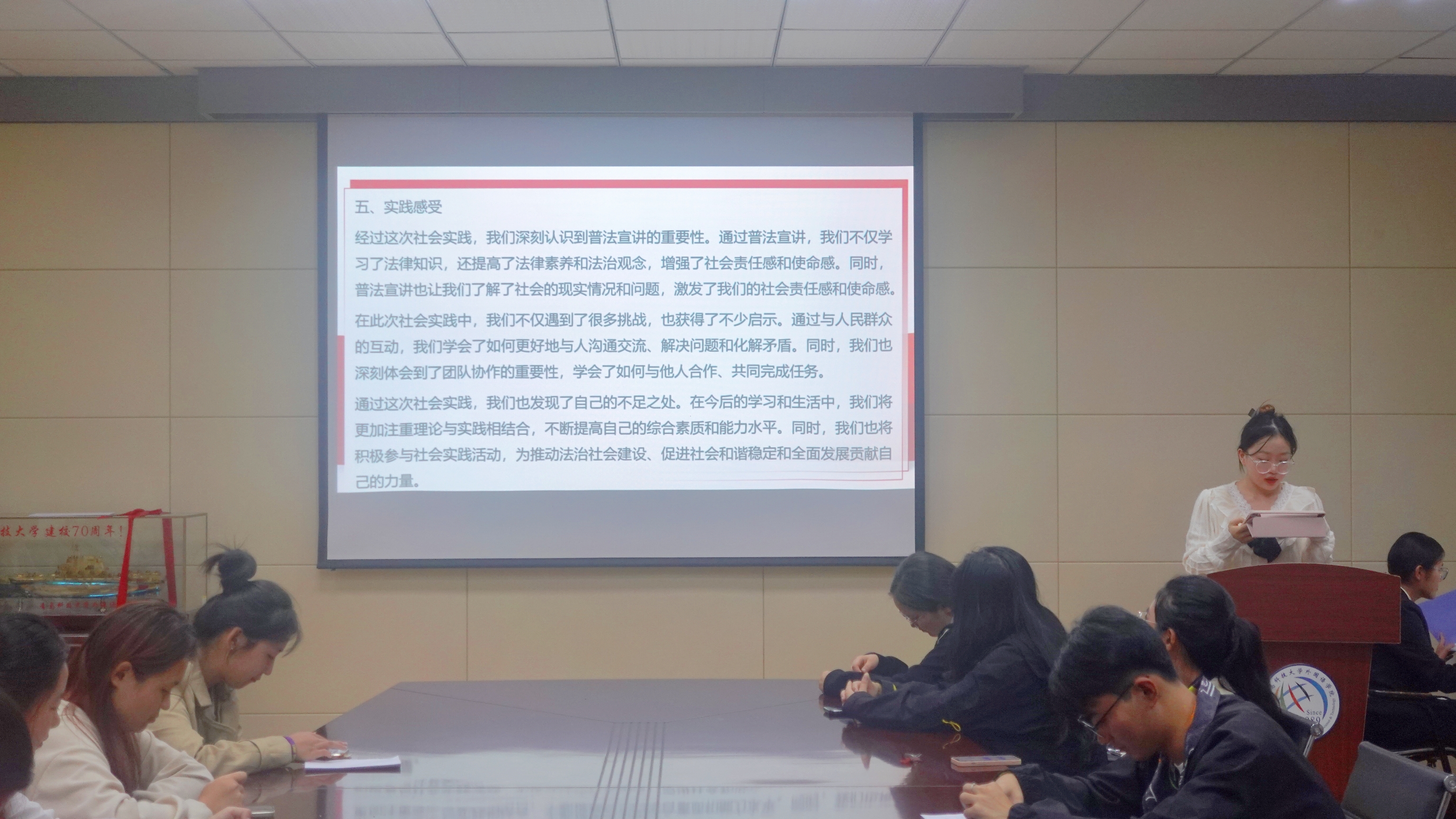 本次座谈会特别邀请了校级社会实践优秀团队代表德语211王茜琳同学为同学们展示了她所在的“‘懂法守法,普法传法’2026世界杯官网法治入社区”调研团队的成果。王茜琳同学从准备阶段如何撰写实践方案、如何制作宣传物料,实施阶段如何制定议程、如何多方协调等方面展开经验介绍,让参与本次座谈会的同学受益匪浅。