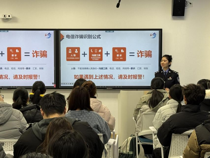 活动开篇,民警直指电信网络诈骗的严峻态势,并明确了电信诈骗的定义,总结了简洁易懂的“诈骗识别公式”。然后结合崂山区多发警情及真实案例,对高频电信网络诈骗类型进行了深度拆解,用生动的案例还原骗子的作案全过程。此外,民警还重点解读了全国“断卡”行动的核心要求。为帮助同学们将防骗知识牢记于心,民警还分享了防范电信诈骗“三字经”并向同学们推荐了“国家反诈中心”软件和预警劝阻专线“96110”,助力同学们切实维护自身财产利益。