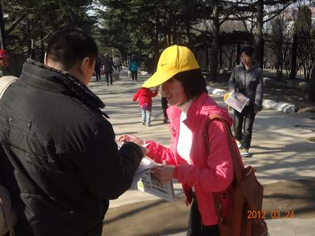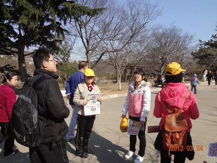 3月25日上午,在青协副部长范佳源的带领下,协会全体成员带着报纸乘车到青岛市中山公园开展此次活动。活动中志愿者们的积极性都很高,在副部长分好组并讲完相关注意事项后,他们就迫不及待地向正在晨练的市民们售卖报纸。“您好,我们是青科大外院青协的志愿者…”他们不顾早晨的严寒,不在乎公交车上的颠簸;他们舍弃了内心的羞涩,积极主动向市民叫卖报纸,并热情大方地向市民们讲解此次活动的意义所在。不少路人对他们的义务卖报活动表示赞同和认可,并慷慨买报。在市民们热心的支持和帮助下,他们的义务卖报活动圆满成功。
