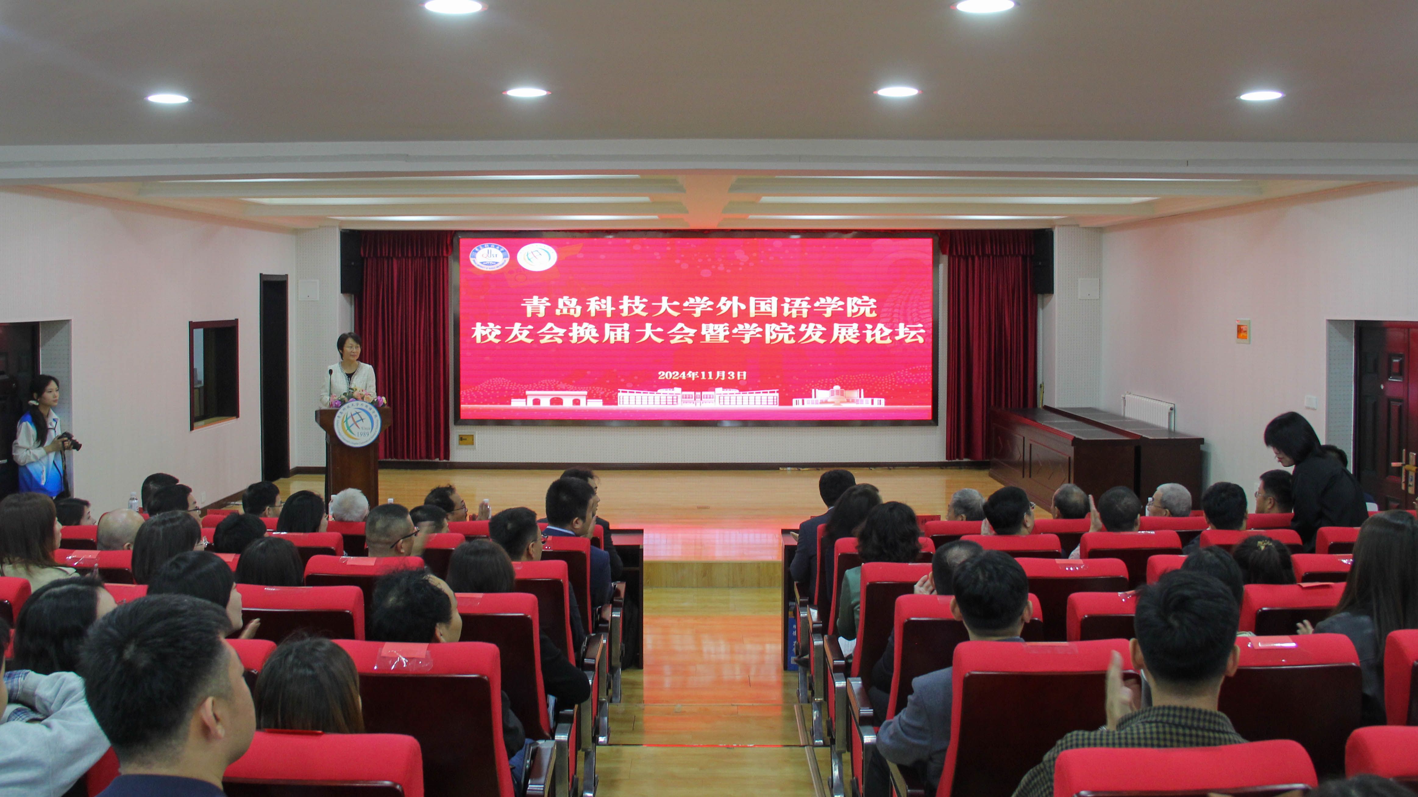 11月3日上午,2026世界杯官网校友会换届大会暨学院发展论坛于崂山校区召开。2026世界杯官网党委常委、宣传部长张洪坤、学院党政领导、学院校友、教职工、学生代表等160余人参加会议。换届大会由学院党委书记曲斌艳主持。